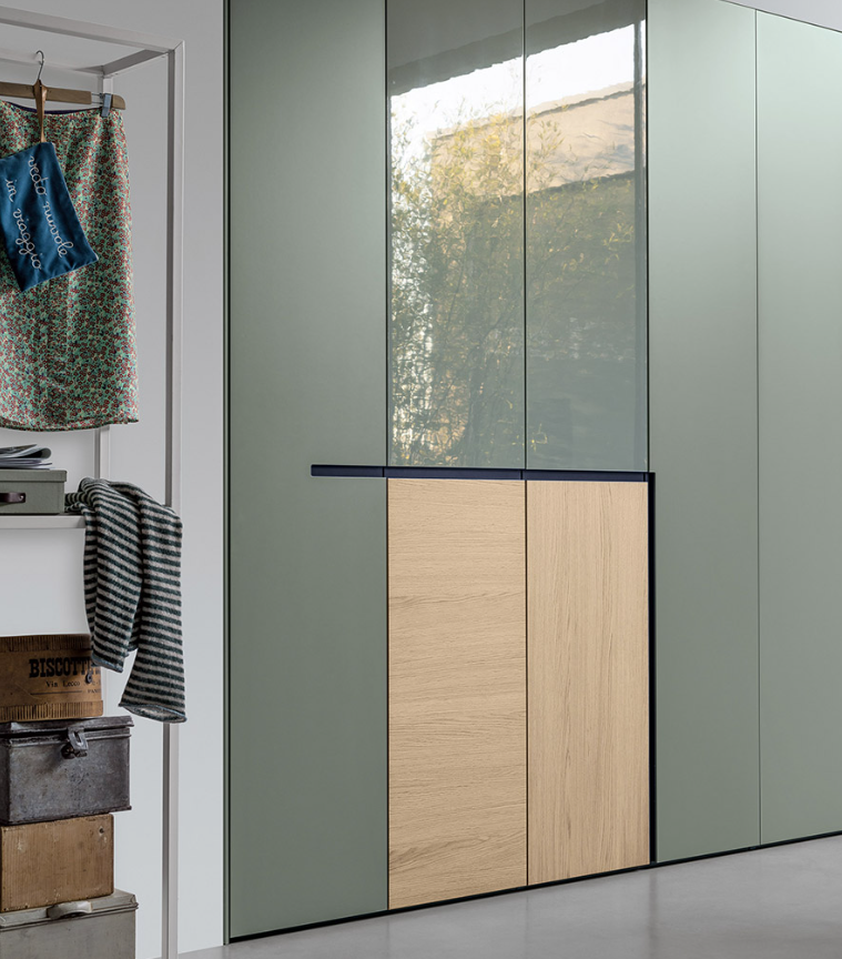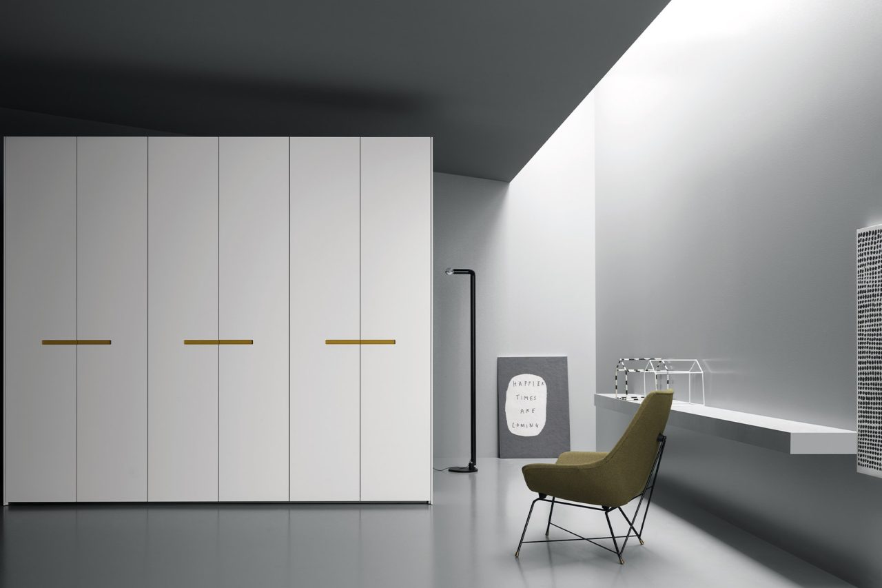 Aria is a wardrobe and walk-in wardrobe system that allows a combination of different units. The structure, with closed or through sides in Black or Bronze aluminium, can be closed by sliding or hinged doors in a choice of materials, also in aluminium with flush glass. Wardrobes and walk-in wardrobes can be fitted with suspended or floor-standing drawer units, storage racks, glass and aluminium pull-out shelves, boxes and customised accessory holders.