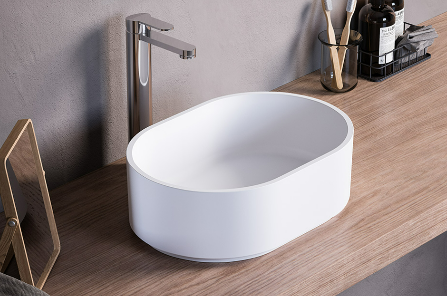 Countertop oval washbasin in matt colored Mineralmarmo or in matt white Solid Surface, with possibility of external Colour finish, glossy or matt.