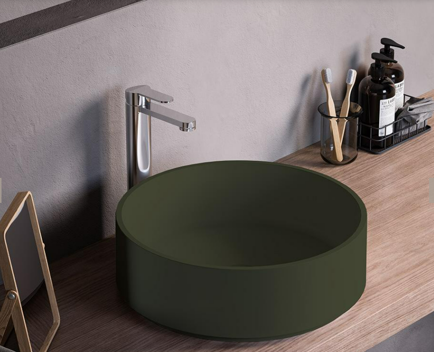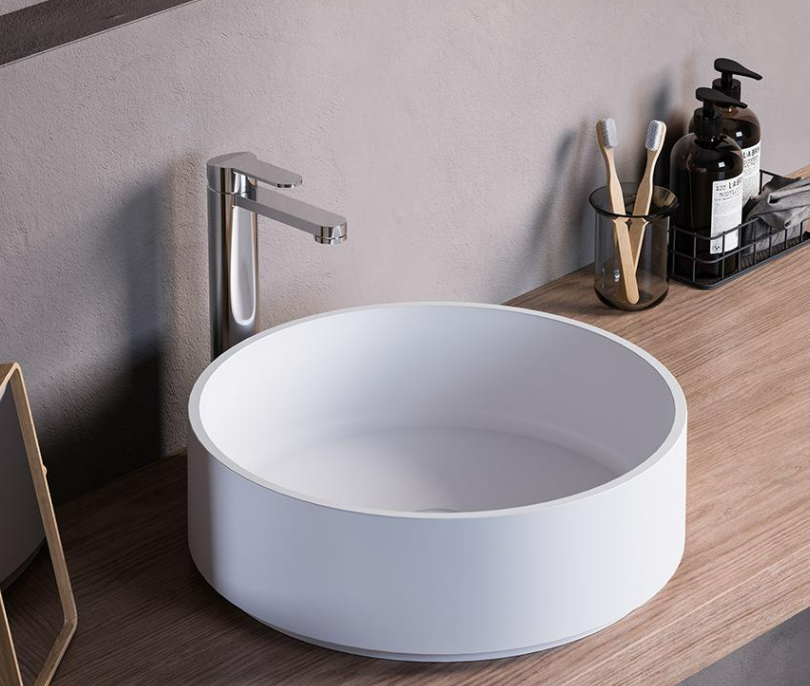 Countertop round washbasin in matt colored Mineralmarmo or in matt white Solid Surface, with possibility of external Colour finish, glossy or matt.
