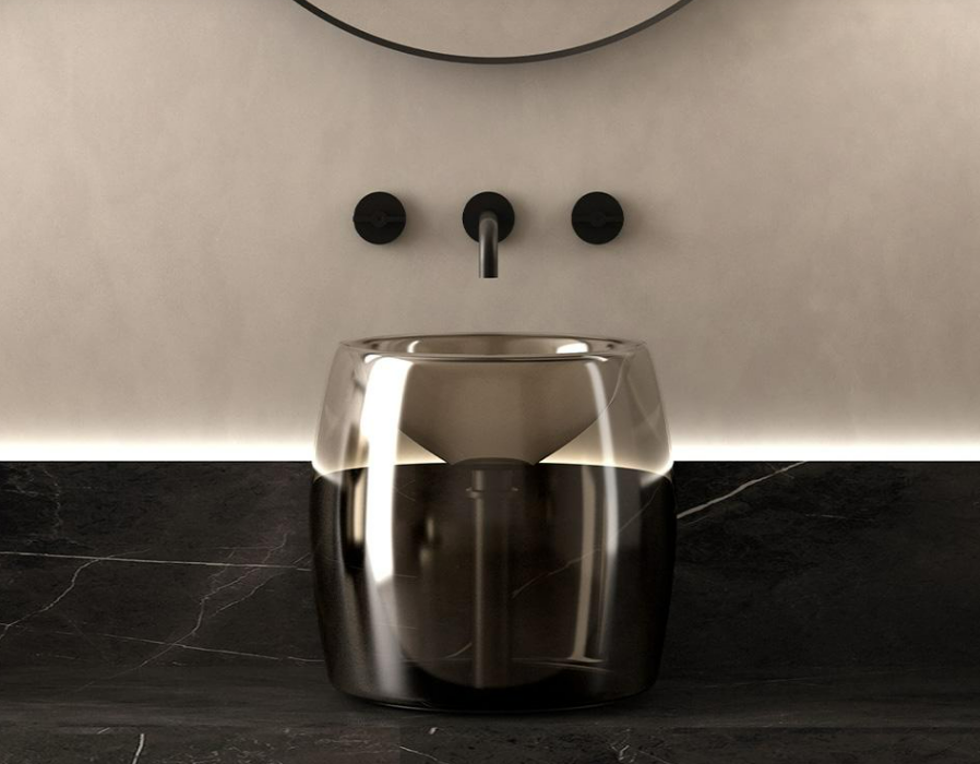 Countertop washbasin in transparent blown glass, available in Grigio Caldo finishes, with matt black drain and siphon.