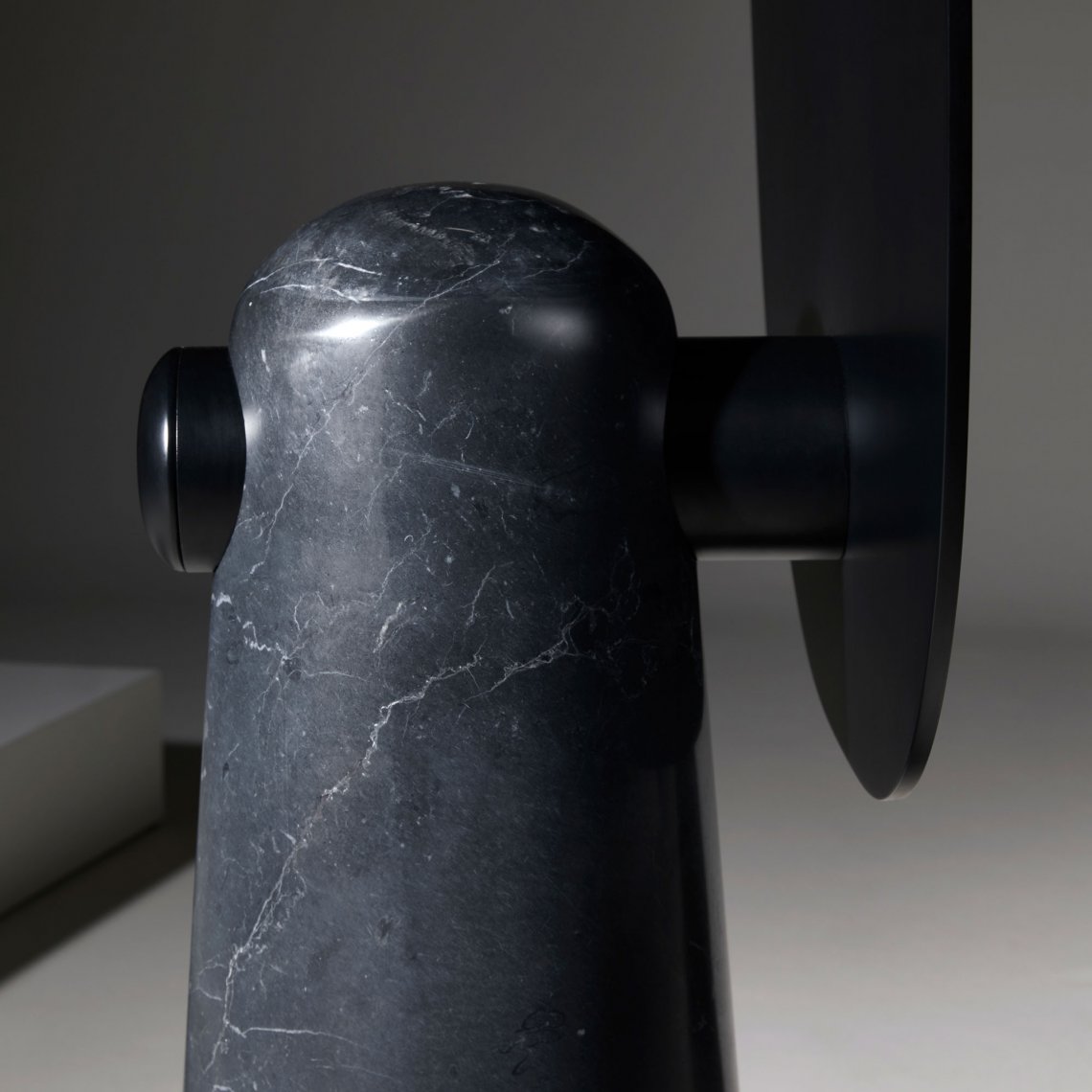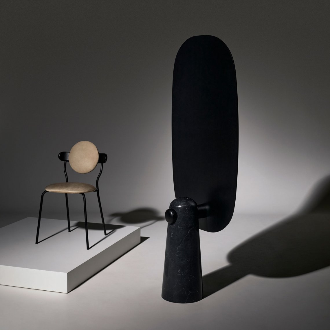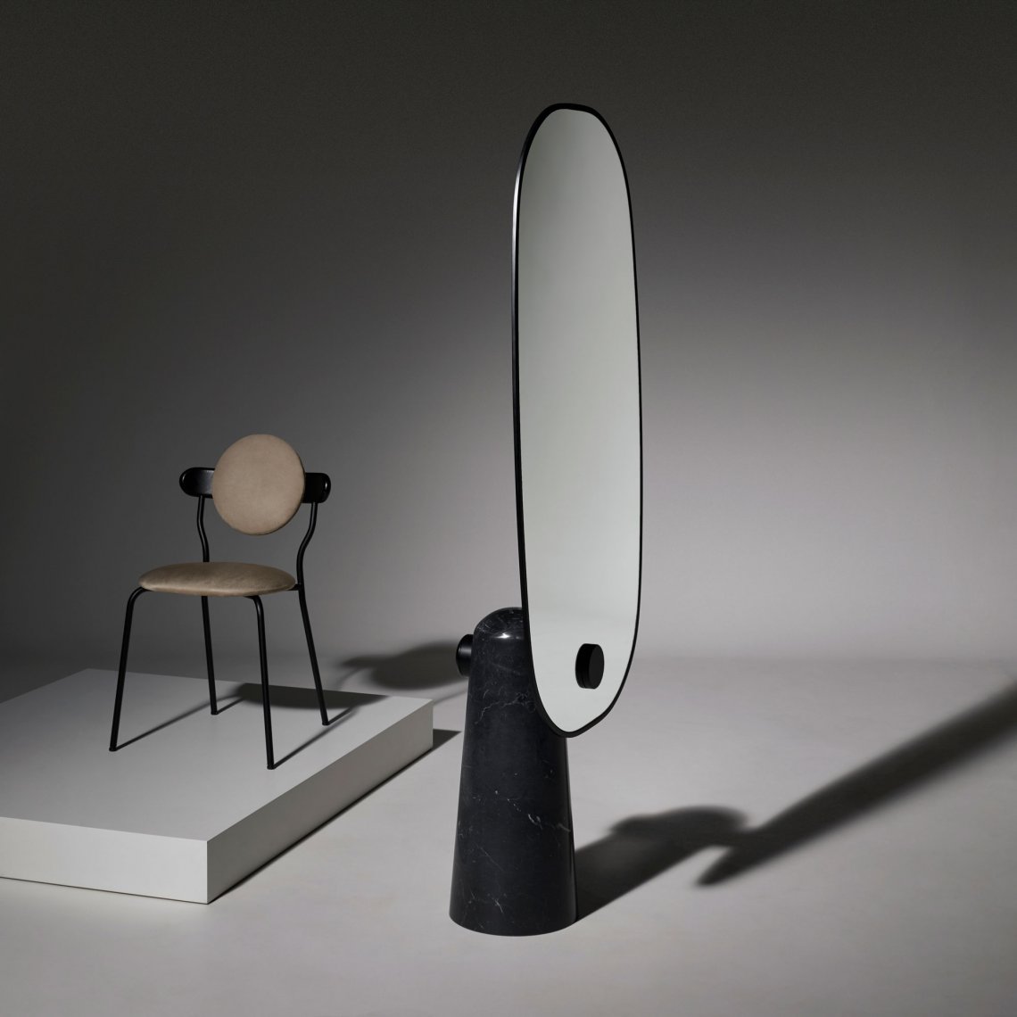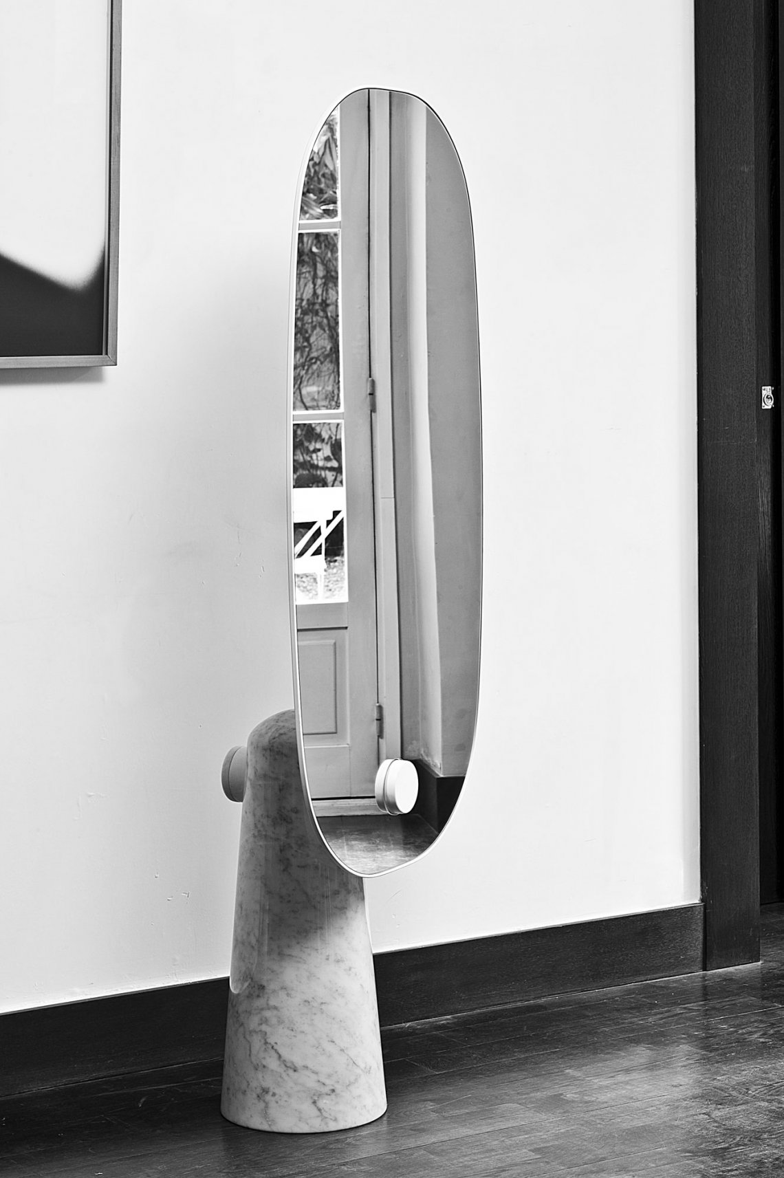 Iconic is a mirror that proudly stands as a statue. The white or black marble base pedestal supports a thin metal structure.
