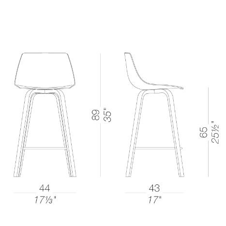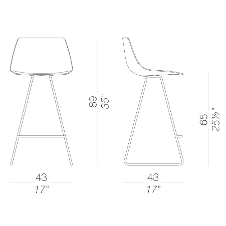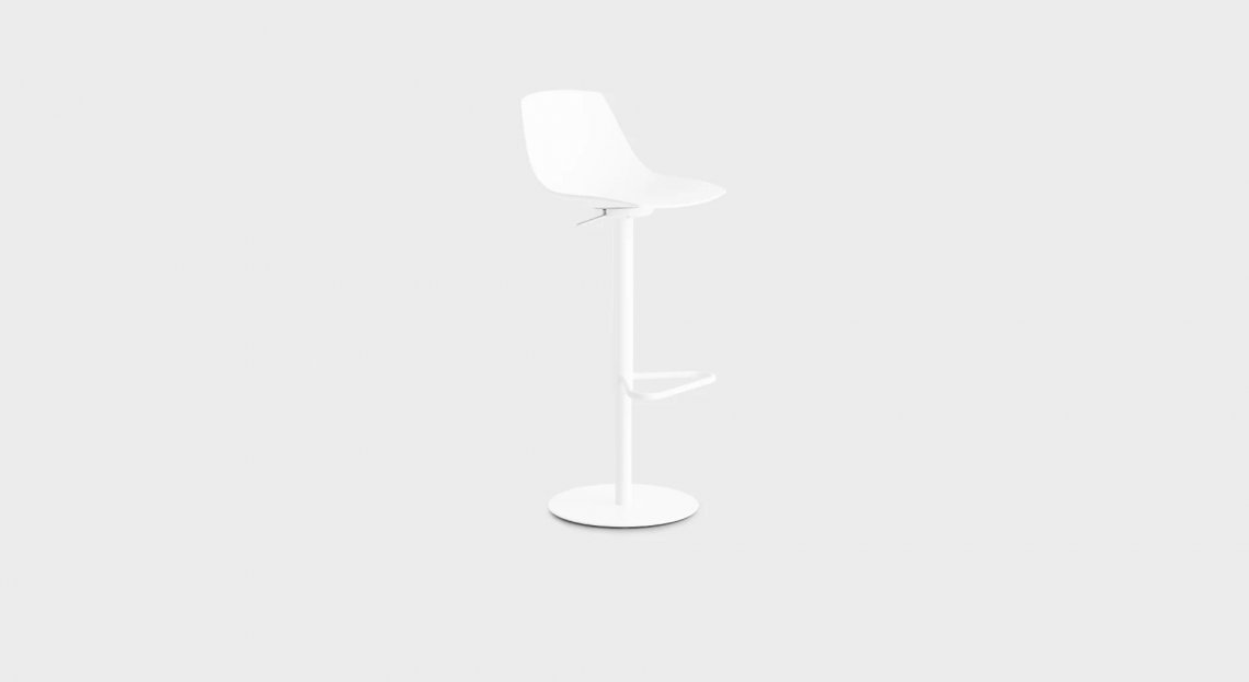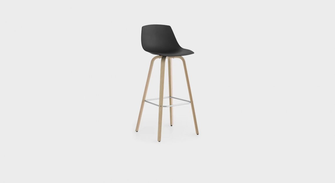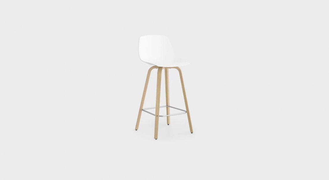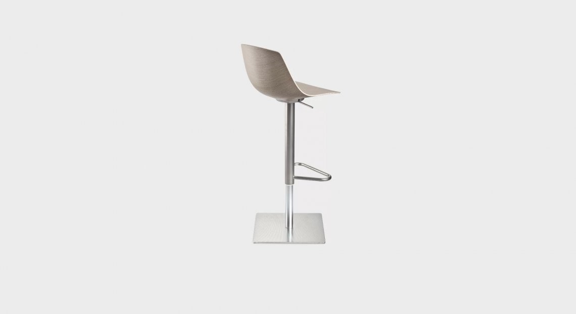 Comodo come una sedia, disinvolto come uno sgabello: questo modello di MIUNN, alto 65 cm, mescola con grande proporzione una base in tubolare di acciaio e un sedile in multistrati curvato con tecnologia 3D.