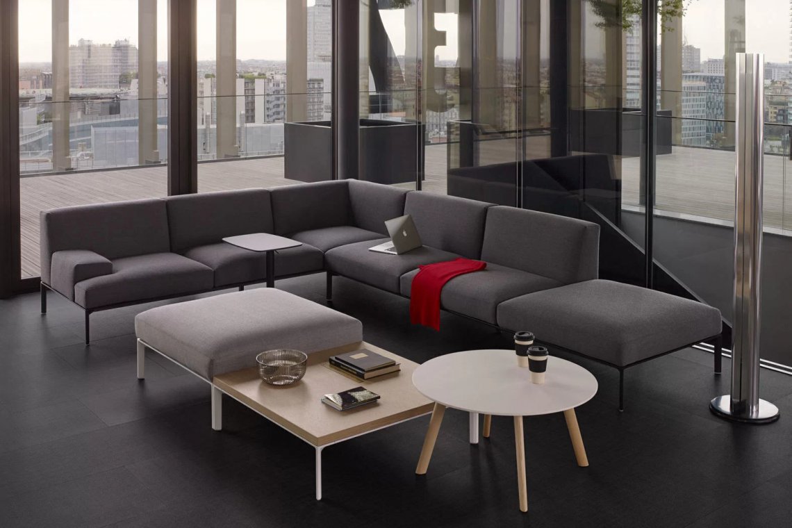Tavolino con gambe angolari altezza 22 cm, in pressofusione di alluminio riciclato verniciato a polveri, con piedini in polietilene. Telaio in estruso di alluminio, unito ai quattro angoli con piastre in alluminio e viti in acciaio inox. Piani in MDF, spessore 30 mm, rivestiti in varie finiture.