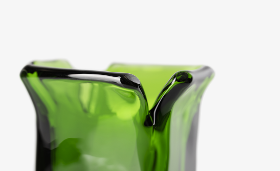 When a glassblower picks up the molten glass and blows, he creates a perfect sphere. Franti?ek Vízner's boxes are unique because, although they are made of metallurgical glass, they are not organic in shape, but rather geometrically angular. The glass boxes resemble paper boxes. They open at the top and arouse the imagination. What is hidden inside? Although they are vases, the primary intention is not to display flowers in them. Vizner created objects to be displayed as solitary objects.