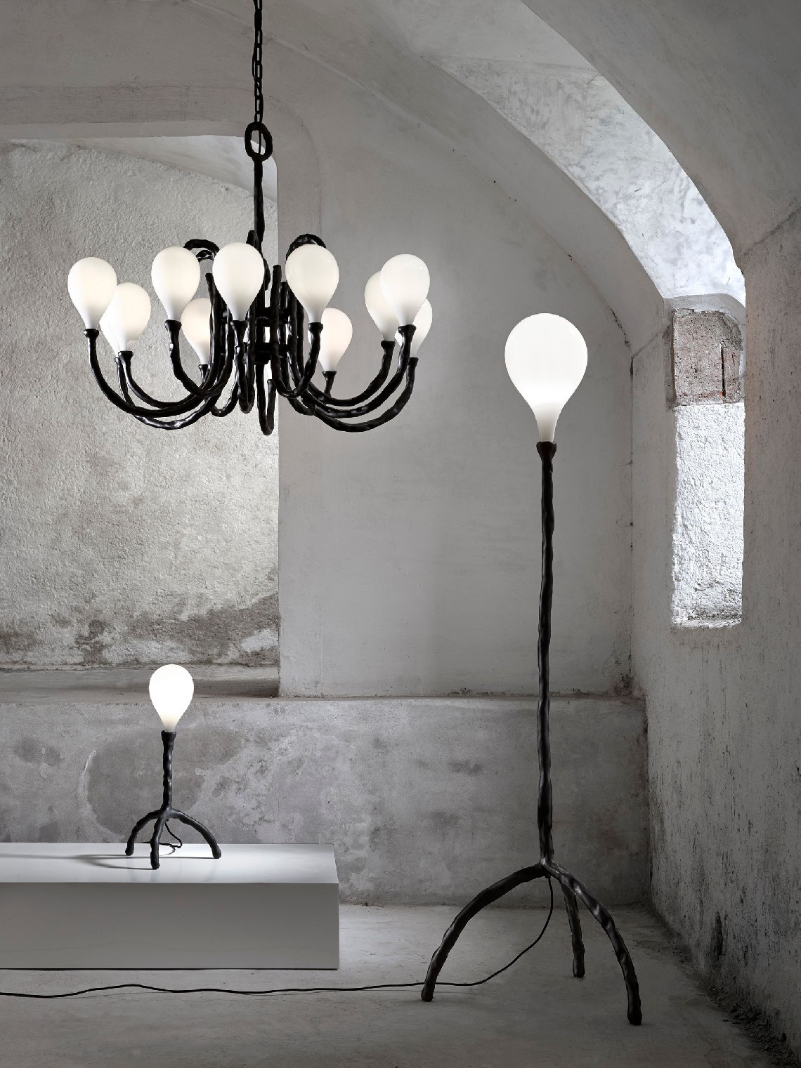 With this piece Maarten Baas looked toward classic, recognizable shapes, yet with a modern and almost comic twist. Technically it’s a unique joint-venture between the classic hand-blown glass by Lasvit and the clay-covered arms by Baas and his production team from Den Herder Production House.