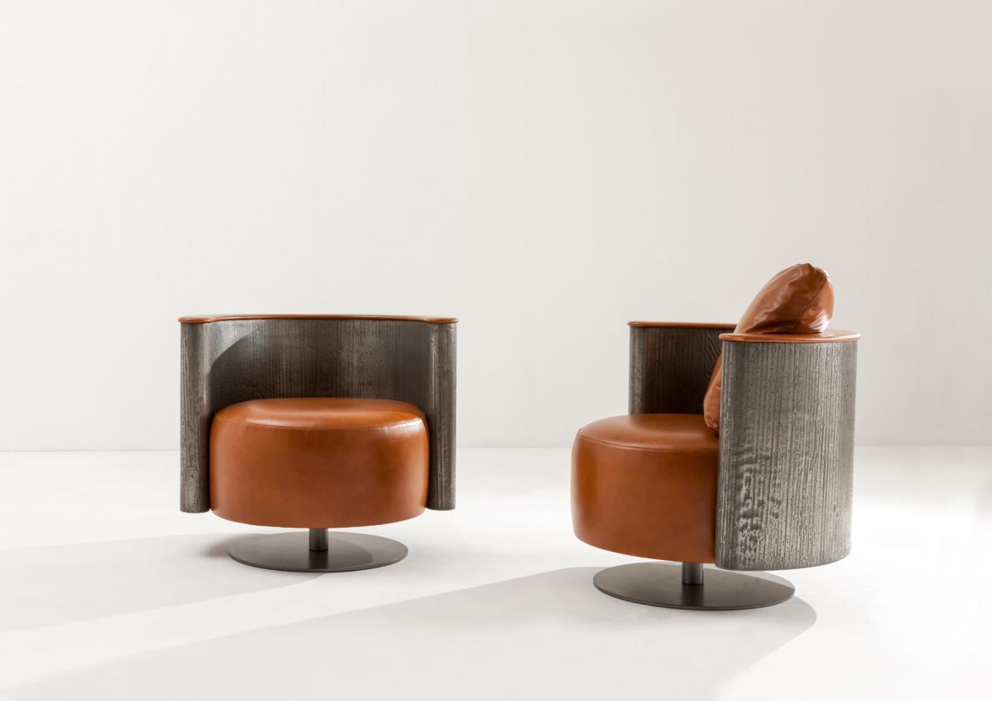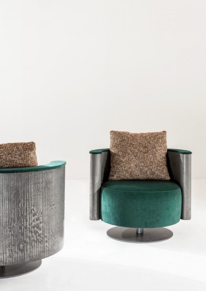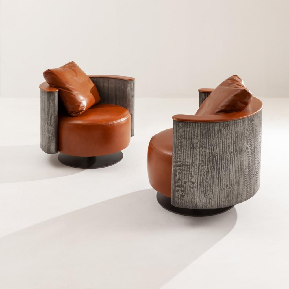 Swivel armchair with rounded shell in plain wood, lacquered wood or in special finishes. Also available in Liquid Metal.