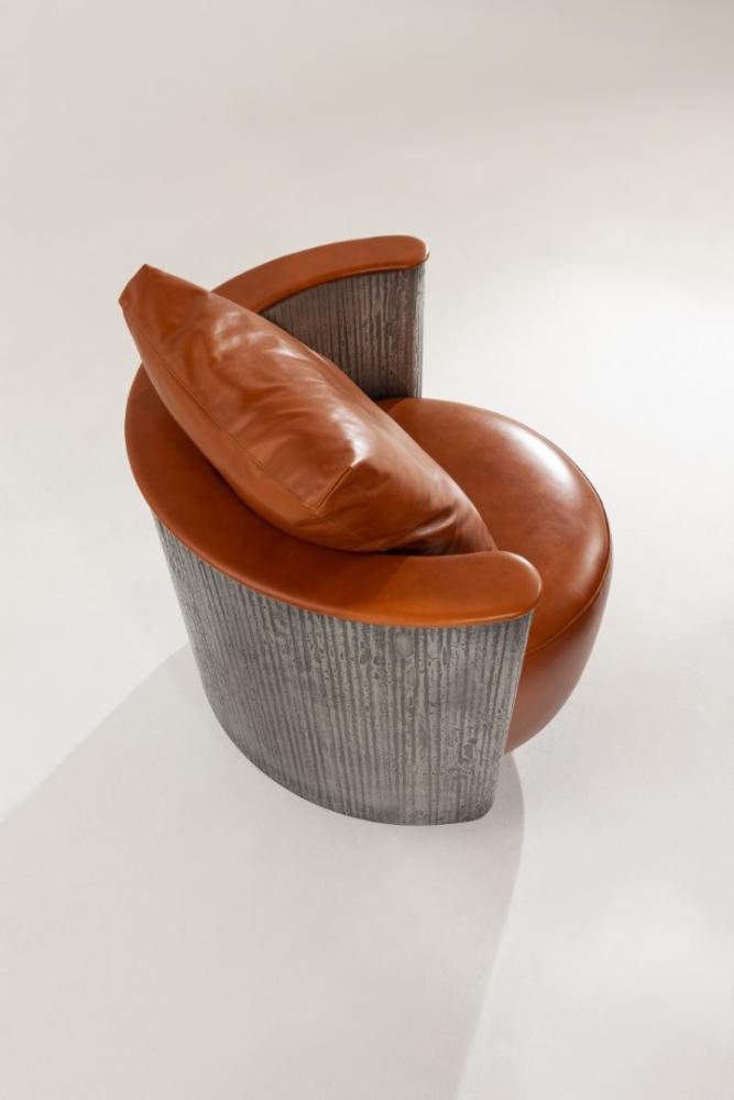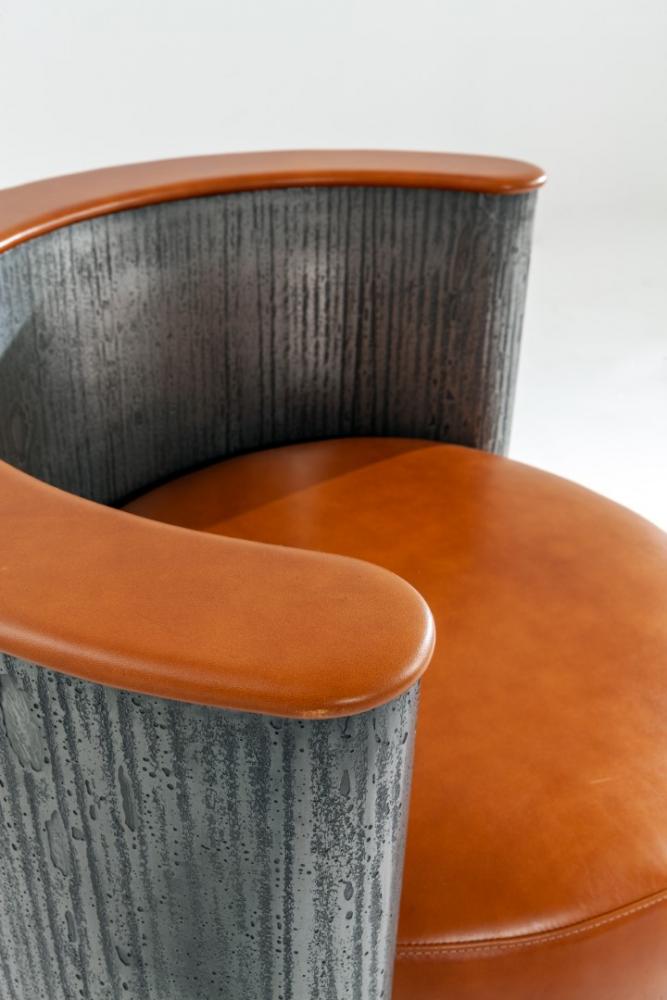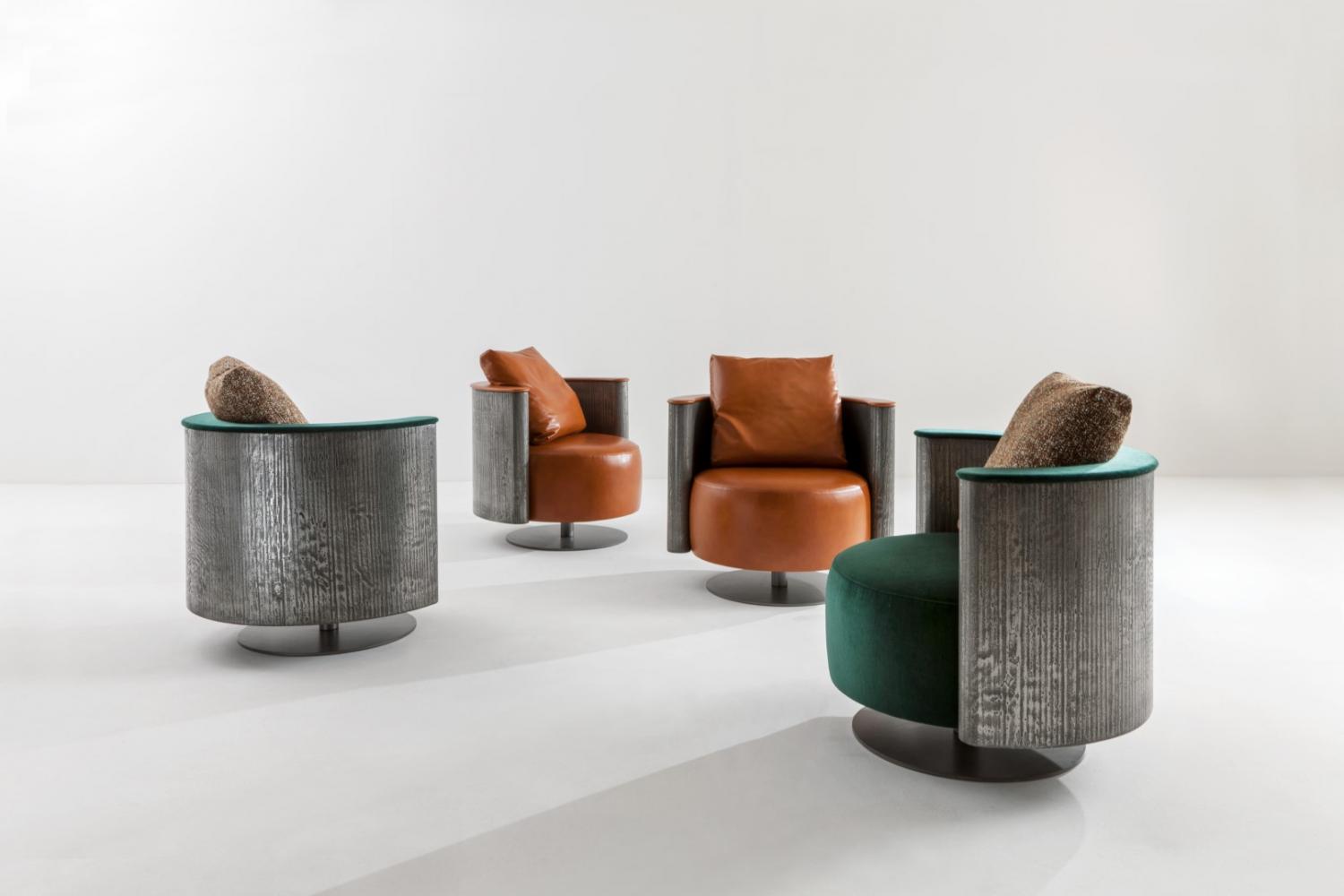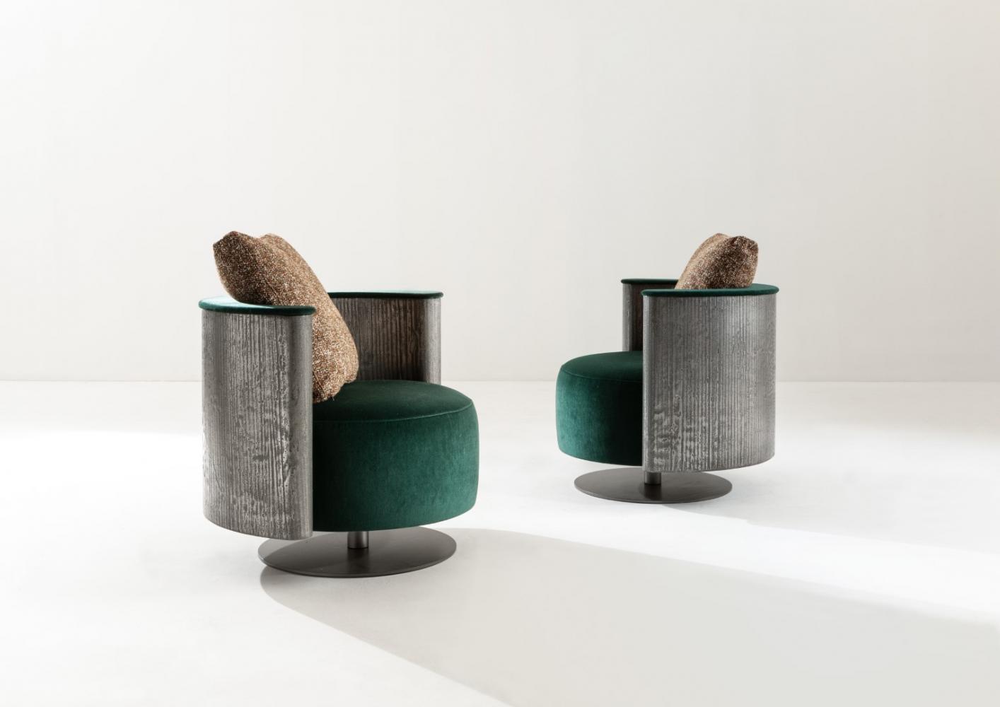 Swivel armchair with rounded shell in plain wood, lacquered wood or in special finishes. Also available in Liquid Metal.