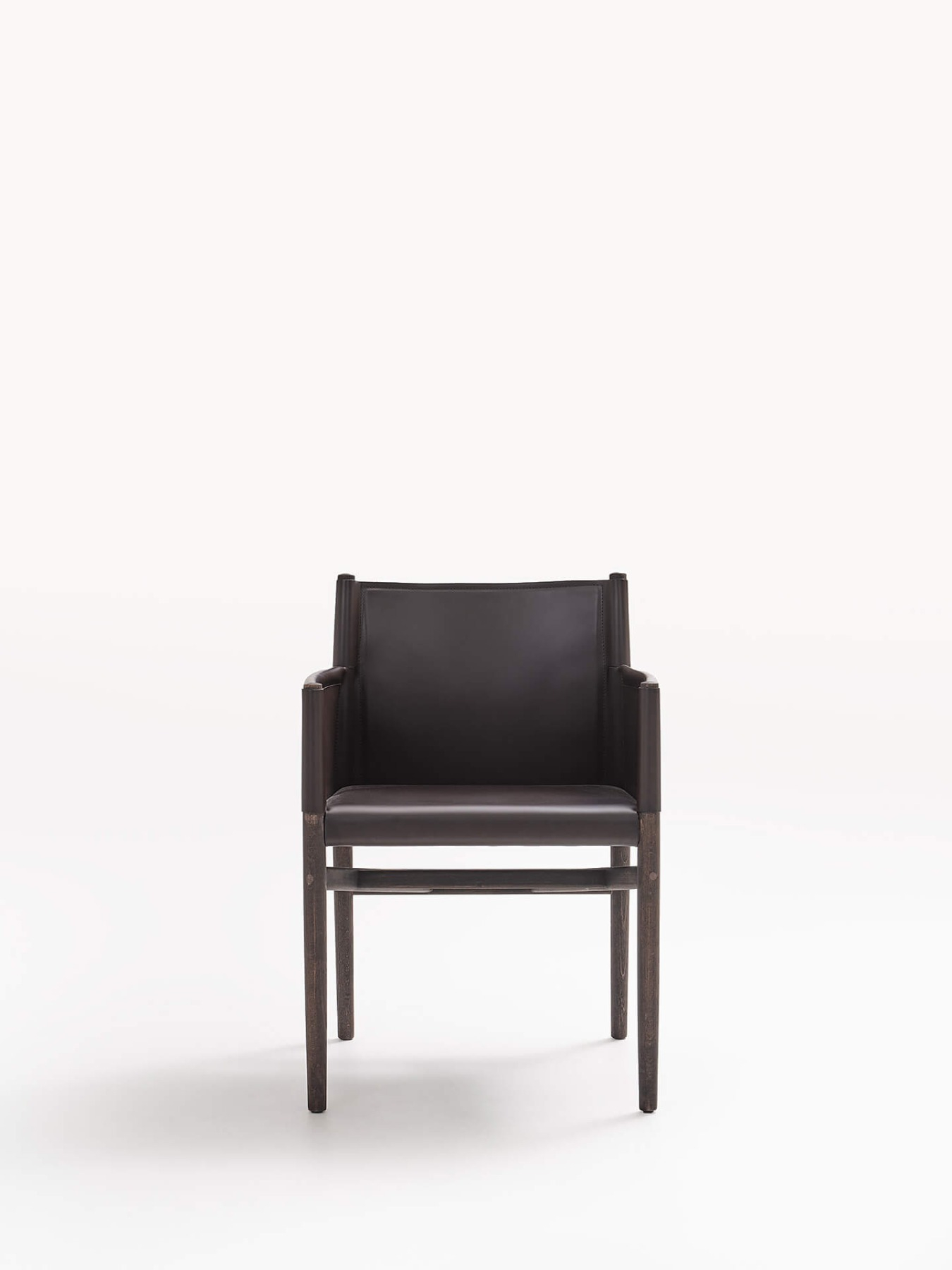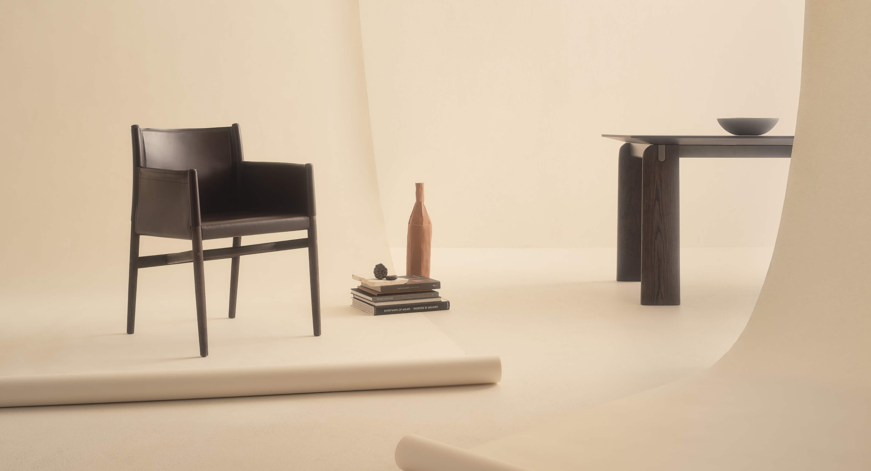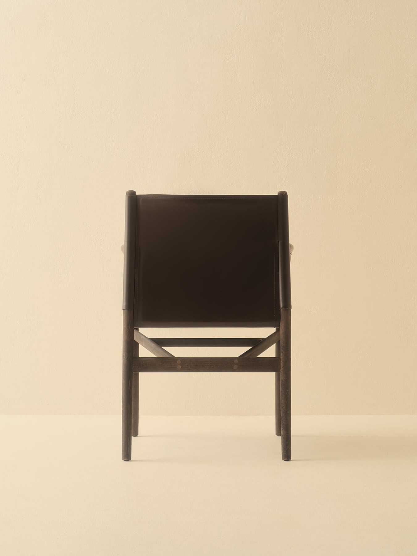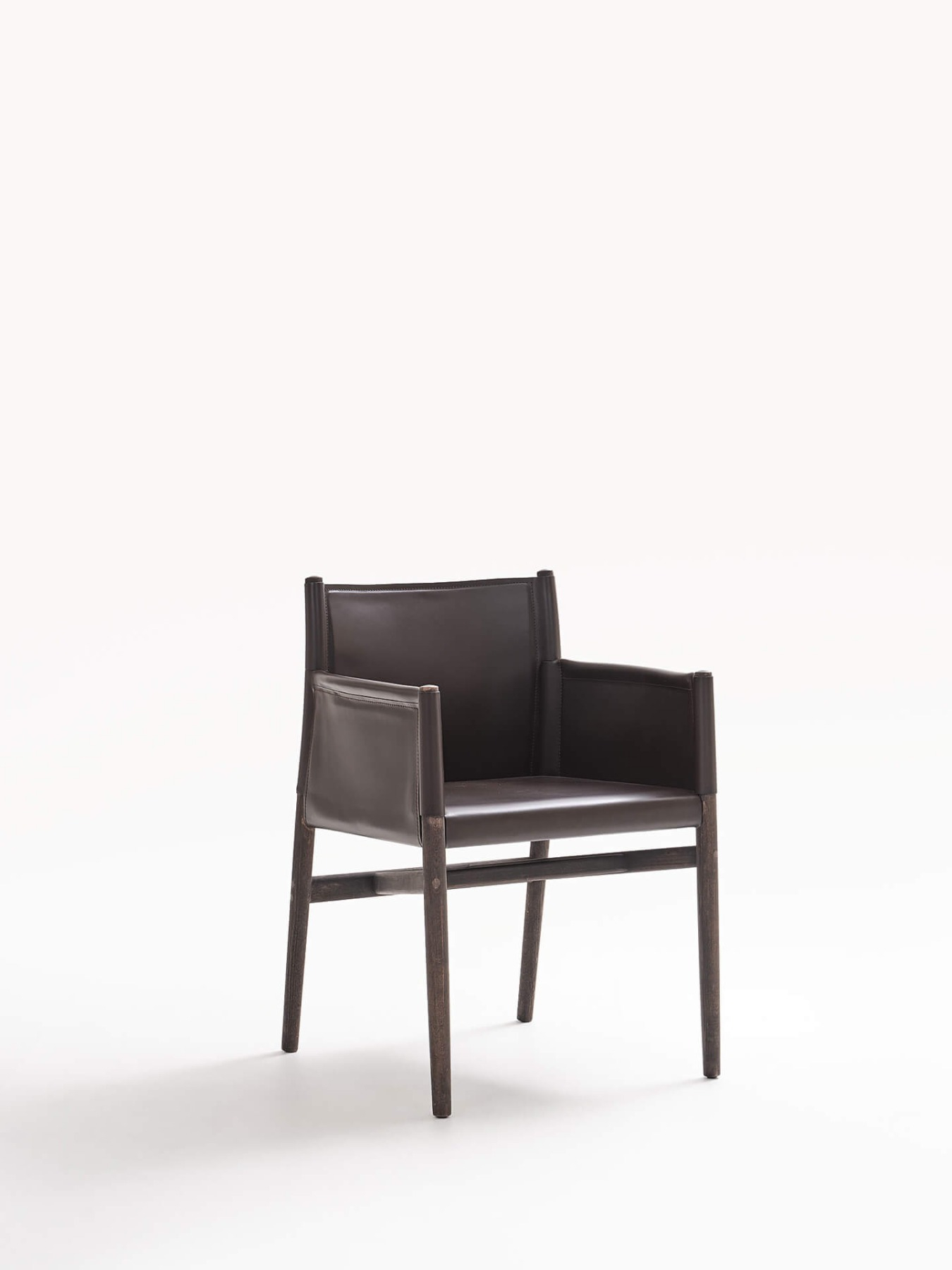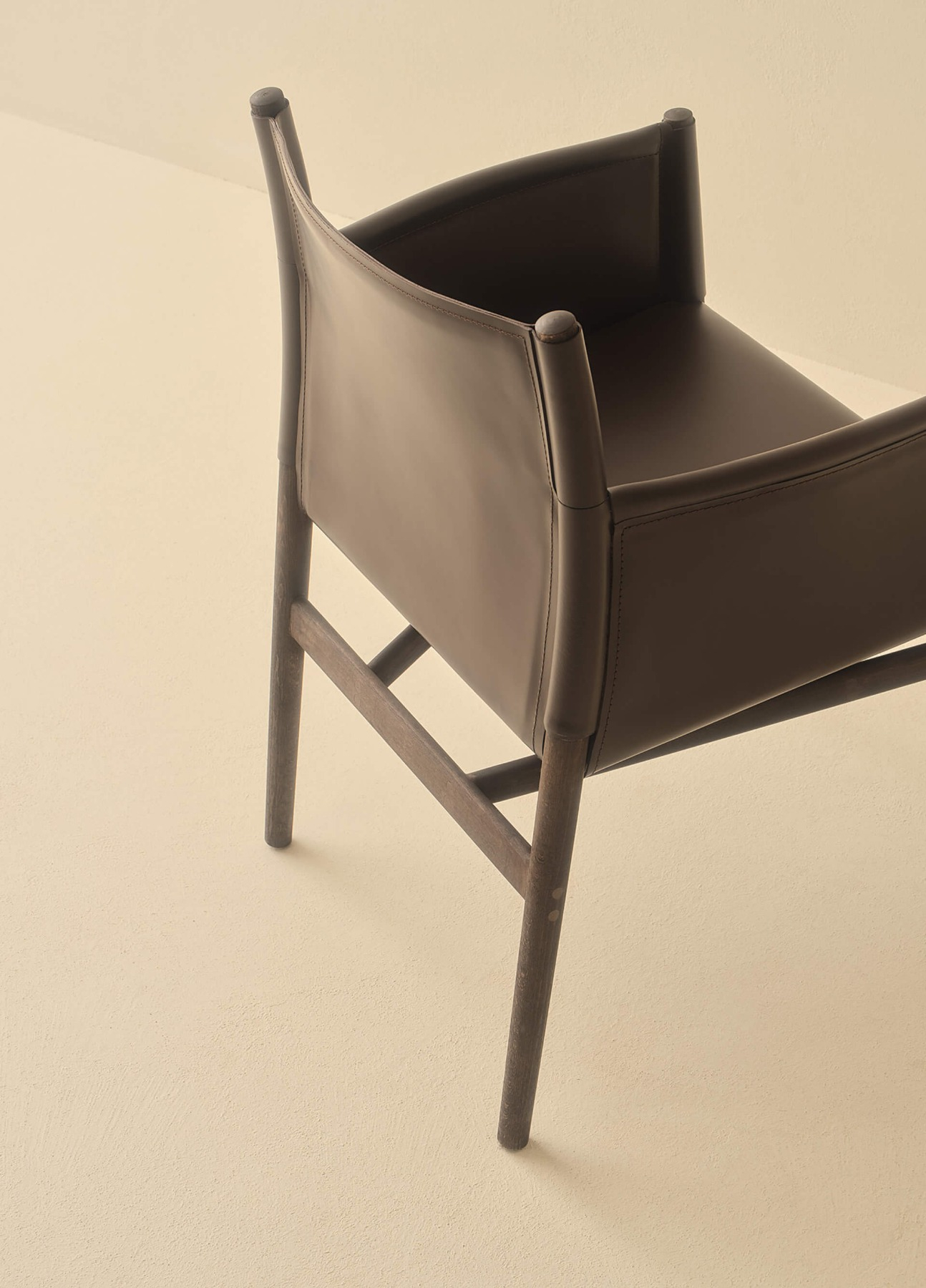 Gabriele and Oscar Buratti's Ayon chair invites you to discover the perfection of artisanal appeal combined with the industrial production of a seat made of light leather with an ash wood structure. Available with or without armrests, Ayon embraces a wide range of colours ranging from lighter and cooler tones to warmer and more intense hues. The leather delicately wraps around the upper structure of the chair, offering a comfortable and refined seat. The visible stitching creates a fine pattern that highlights the manufacturing quality that distinguishes the chair. The natural characteristics and grain of the ash wood structure are emphasised by the thermotreated oak stain: thus, a combination of materials is born in which the beauty of imperfections in natural elements becomes the expressive strength of the design