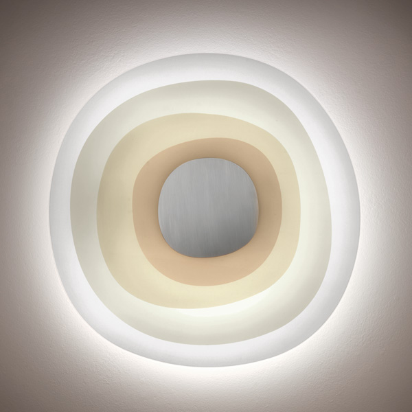 Beta, designed by Paolo Franzin, is a wall and ceiling lamp that plays with the nuances of its light source. Its simple gradient of color on a glass plate results as a beautiful white when turned off but becomes a display of beautiful fading sand colors when illuminated. The result is something in between a functional lamp and a work of art. Beta is available in two sizes, Big (52 cm - 20 1/2") and Small (35 cm - 13 3/4").