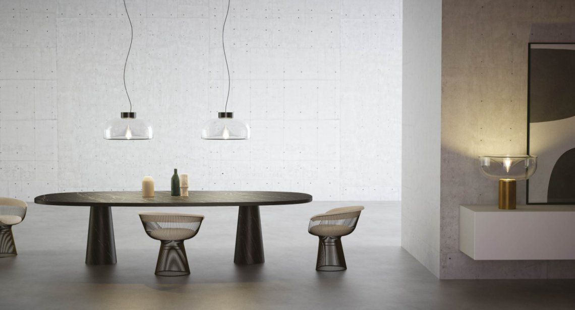 Aella è il tornado, il movimento creato dal dinamico diffusore in vetro soffiato. Da un punto nello spazio prende forma un suggestivo ed evanescente cono di luce, fonte di morbide forme ed armonici riflessi. Disegnata da Toso & Massari, la collezione è composta da lampade a sospensione e da tavolo che racchiudono i principi di design essenziale e senza tempo caratteristici dei prodotti Leucos