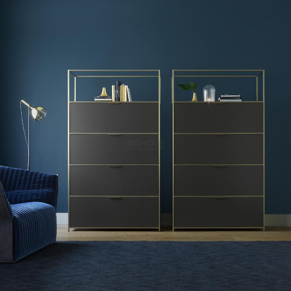 CONCEPTION : although it might be evocative of certain metal modular systems from the office world, Dita clearly distances itself from these in a number of ways: its lacquered panels are in wood rather than sheet metal; its discreet profiled uprights with their sophisticated finish are perfectly placed, cast and not part of the structure; a matching handle which is light and beautifully designed; and its small, slim feet which continue the line of the structure in a very natural way. QUALITY OF MANUFACTURE & FINISHES: uprights are in 15 x 15 mm anodised aluminium section in a brushed bronze finish. These frame the wooden panels which are finished in argile lacquer on the interior faces and in a choice of 16 colours for all visible exterior faces: - satin white, argile and perle (standard), - brique, bleu lavande, chocolat, moutarde, elephant, ranger, noir, bleu nuit, brun acajou, bleu gentiane, cuivre, gris platine (to order). All items are single-sided but are finished on the back (back panels and edges in argile lacquer). Certain items may be given an optional double- sided treatment, with the addition of a rear finishing panel. Handles are in injected zamak, lacquered bronze to co-ordinate with the uprights. Hinges are black. The feet H 30 mm continue the line of the uprights and incorporate a black jack. The new shelving unit, at H 189 cm the same height as the storage column, has shelves in a choice of 17 finishes: grey smoked glass, satin white/argile/perle lacquer, plus the 13 'to-order' lacquer colours (brique, bleu lavande, chocolat, moutarde, elephant, ranger, noir, bleu nuit, brun acajou, bleu gentiane, cuivre, gris platine). The 4-drawer chest is composed of 3 identical drawers topped with a narrower upper drawer. The 6-drawer chest is composed of 5 identical drawers topped with a nattower upper drawer. The bench/TV unit is available in 2 versions, either with a cushion or with a lacquered top. It comprises 2 flap doors with 2 lower glass shelves (could be used as hallway storage). The cushion in high resilience polyurethane Bultex foam 53 kg/m3 – 6.3 kPa is covered in Steelcut trio 3 (choice of 53 colours).