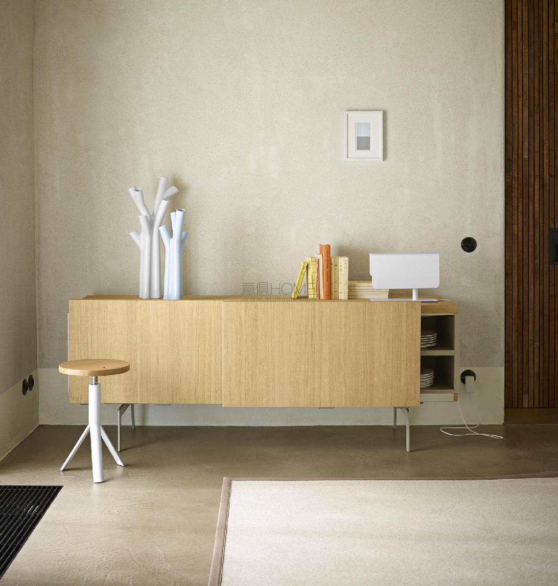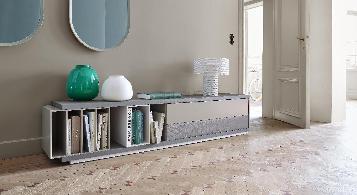 SIDEBOARD WITH COPLANAR DOORS: this sideboard, in the same dimensions as the 4- door sideboard, is equipped with 2 coplanar doors. The internal space is split into 2 halves with a large central shelf in each. The 2 coplanar doors are in the same finish. OCCASIONAL UNIT: with a height of 146 cm, this piece comprises 2 hinged doors with a niche to the side (to the left or right). Working on the same principle as the lateral niche in the sideboard with hinged doors, it is equipped with 3 shelves held within a lacquered aluminium frame. Choice of internal fittings: 3 large full- width shelves or with vertical separation panel and 3 shelves in each section.