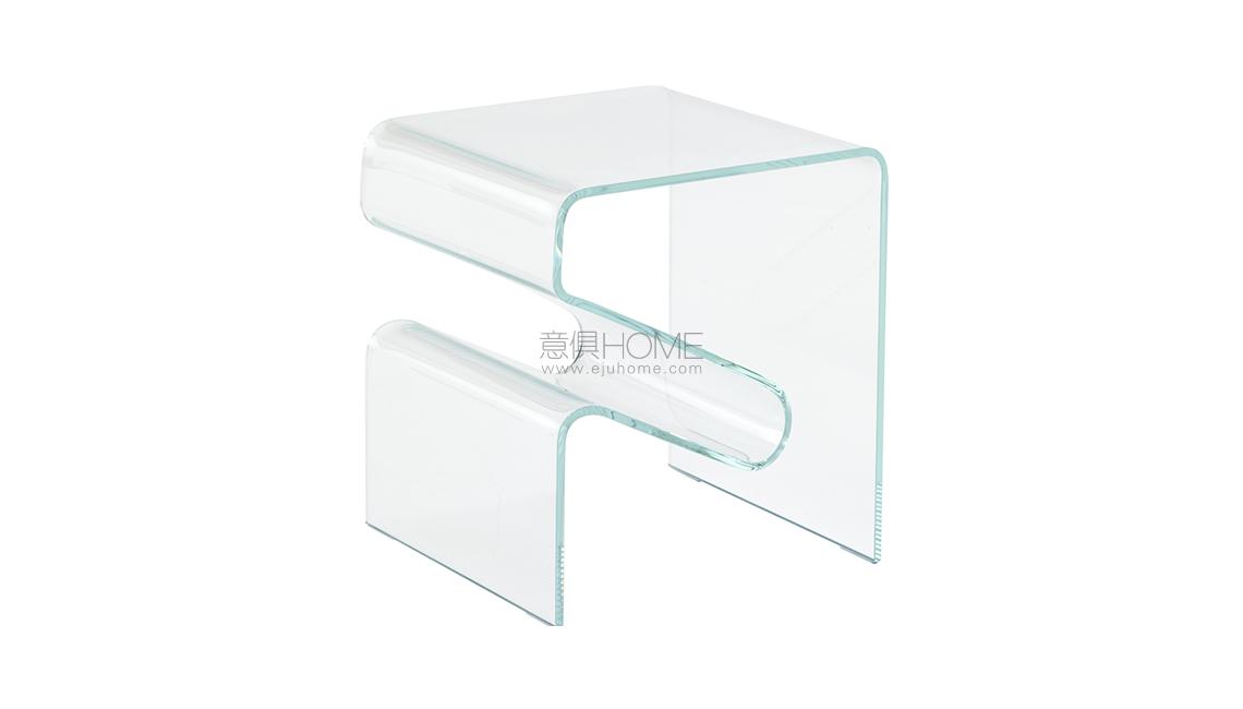 Occasional table / magazine rack in 10 mm thick curved 'cristal' glass with 4 transparent plastic gliders.