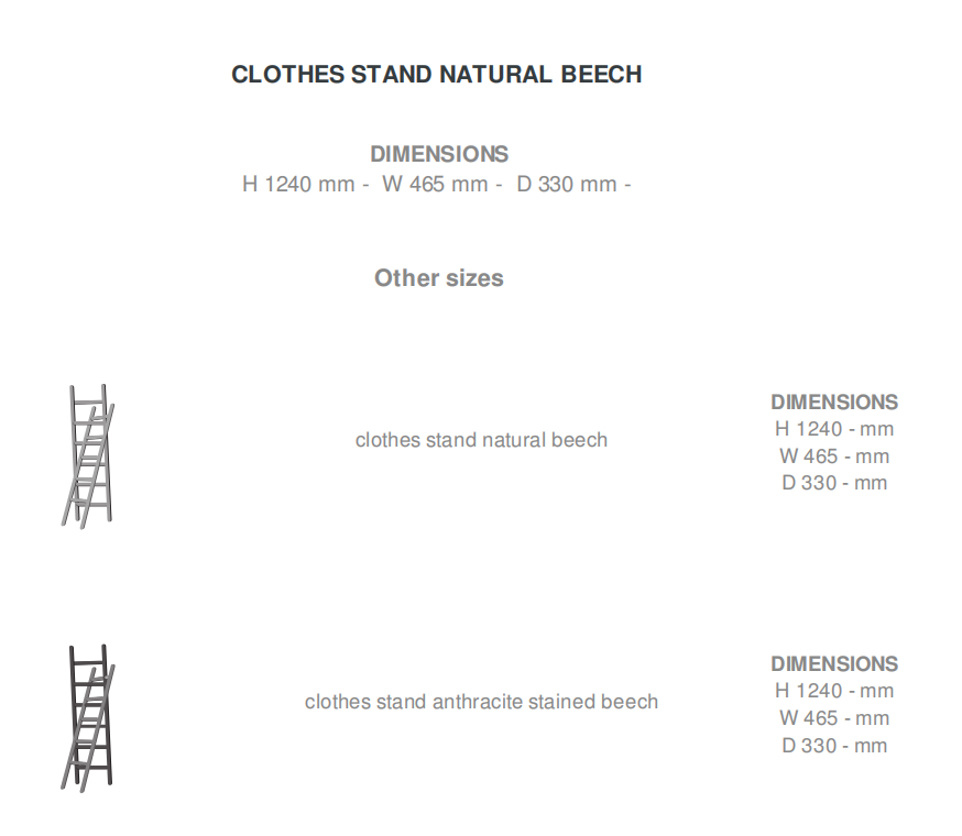 Coat rack in satin-finish natural varnished solid beech or satin varnished black or anthracite- stained beech. Feet are equipped with light grey felt pads.