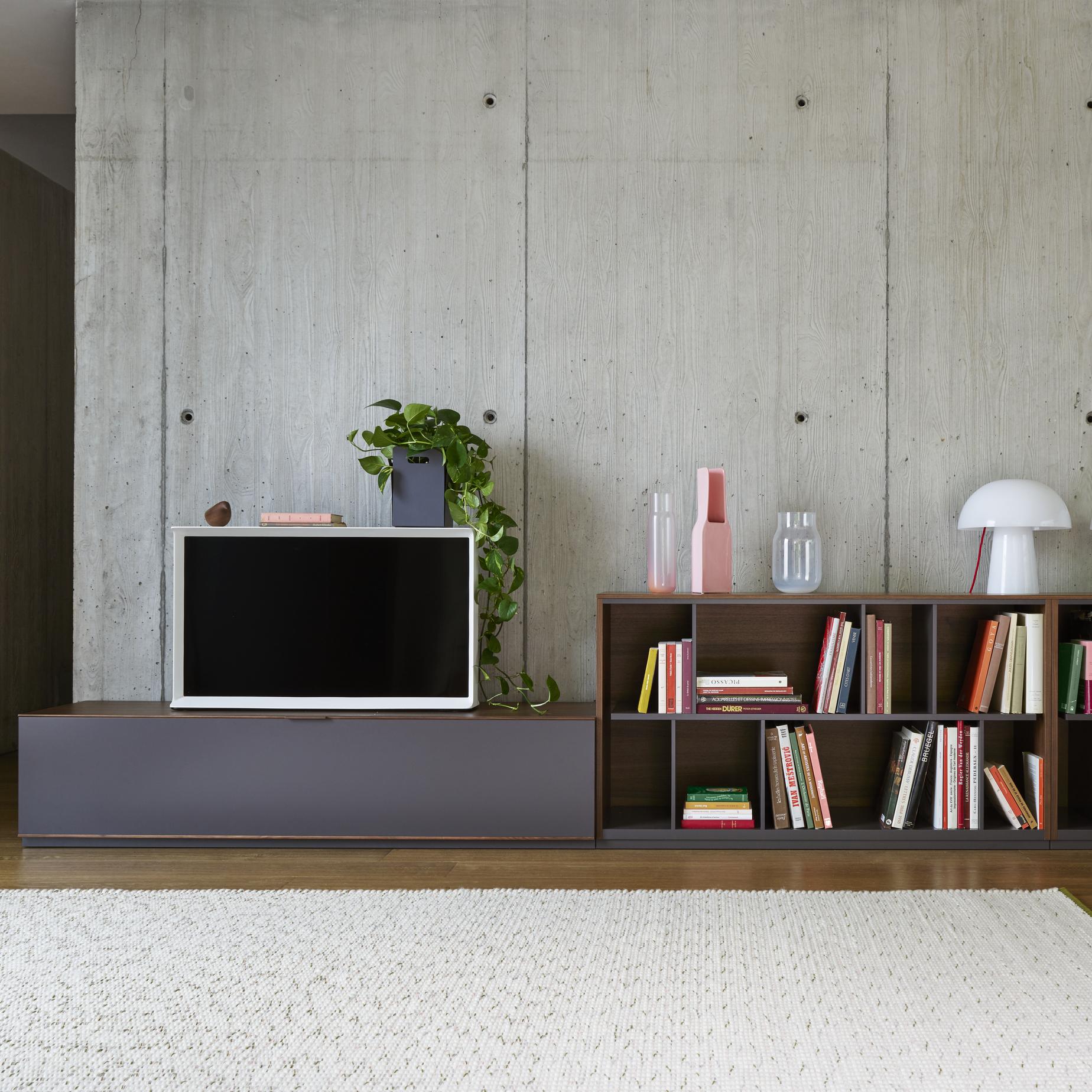 CONCEPT & DESCRIPTION : “Canaletto’s modular nature opens up new horizons in terms of containing, but also displaying, showcasing, demonstrating...Open or closed modules and staggered vertical separations confer remarkable graphic lightness reminiscent of the tableaux of the view painter Canaletto. The closed chests are given substantial and extremely significant character in the profiling, both horizontally and vertically, of the flap doors and drawers, thanks to the profiled uprights and projecting handles in ‘Canaletto walnut’. These finishes transform a furniture system into a jewel with a unique spirit which draws the attention to the manufacturing details and a refined appearance. With Canaletto, putting together a composition will no longer be a puzzle or a series of difficult choices between function and aesthetics. Canaletto is an essential expression of a tranquil design response to the practical demands of modern life.” Mauro Lipparini An elegant modular range combining lacquer with solid wood. Note the quality of finish as embodied by the dark walnut lip which serves as a handle for the doors. It responds perfectly to contemporary requirements of a modular system, offering solutions for hi-fi and storage, plus shelving and a sideboard. Items are created by juxtaposing elements. Once the structure is defined - H 50 (TV unit), H 75 (sideboard), H 145 or H 210 then W 67 or W 135 – it can then be completed in a number of ways. Shelving can be located in the lower section with a door above, or vice versa. One could also have full-height shelving, or even close the space completely. The end result of this is an undeniably original style with a powerful identity. The shelving can be equipped with 2 or 3 optional illuminated vertical separations (predefined) to provide refined, indirect LED lighting (LED ribbon, glued in place, with a reflector which slides along the vertical panel). The double doors have the unusual feature of having only one handle on the right-hand side. This touch of visual lightness is all part of the overall minimalism. The left-hand door may be opened via a finger-hold on the edge once the right-hand door has been opened. Wooden elements incorporating slim aluminium shelves may be used to dress a wall. If these are extended towards the floor by an additional wall panel, a complete wall panel is created. A choice of 3 widths is on offer. These wooden elements may be complemented with illuminated LED strips which are located towards the top and across the width of these wooden elements. With his sense of proportion, and with the rhythm and looks he has brought to it, Lipparini’s new modular range is both luxurious and high-end. Thanks to its simplicity, it is immediately comprehensible. The lacquer colours have been selected with care : elements may be plain, in either plomb or perle lacquer, or these two lacquer colours may be combined with dark walnut veneer. Argile lacquer is always used in combination with dark walnut and interiors of chests in argile lacquer are always in plomb lacquer. The doors come with a vertical solid walnut lip to both left and right. The shelves are perforated on the sides. The subtle nature of the indirect LED lighting, and the addition of a glazed element (green- coloured, H-shaped) in the shelving unit reinforces the understated elegance of the alliance of materials. Probably one of the best-finished ranges in our collections, this is a real work of cabinet-made art.
