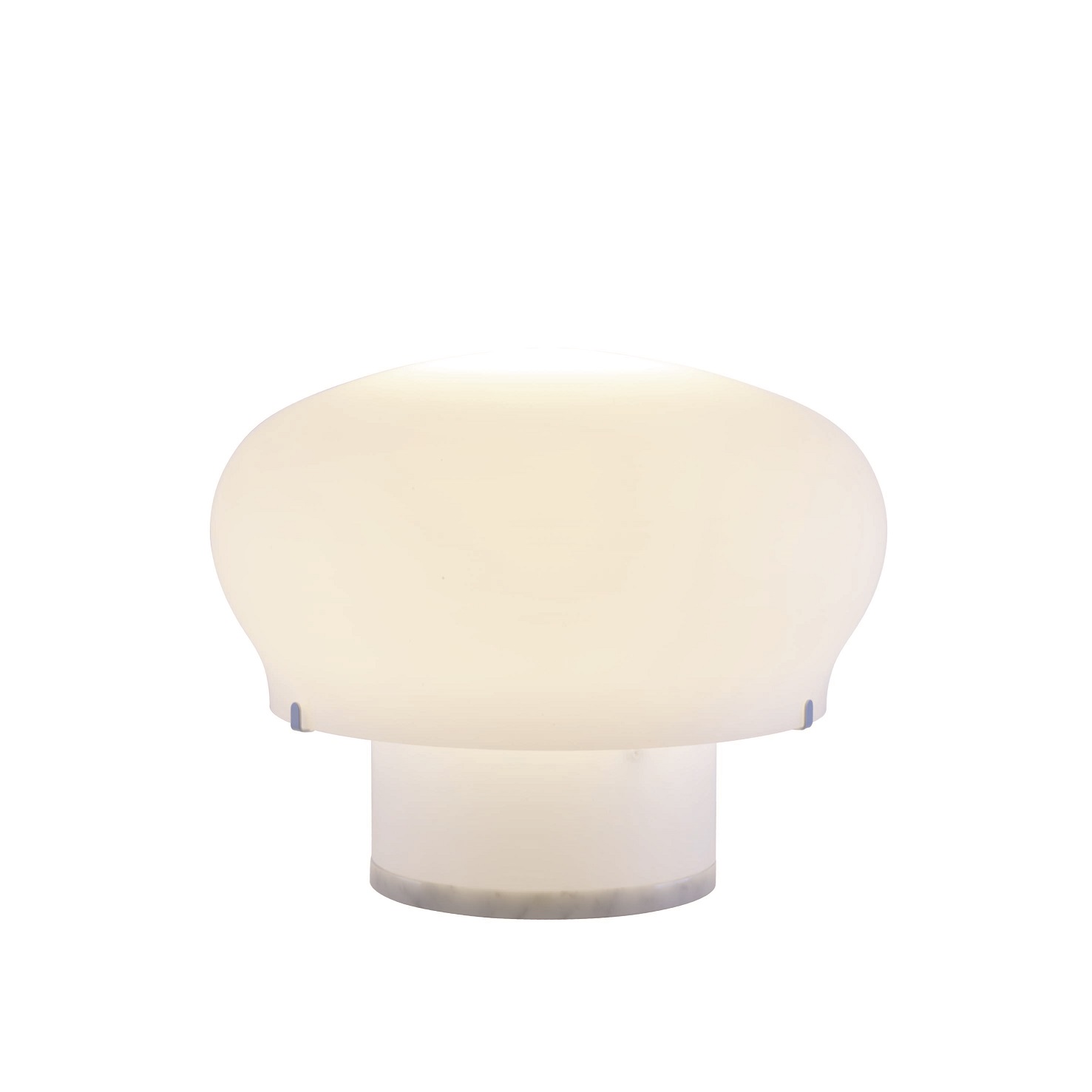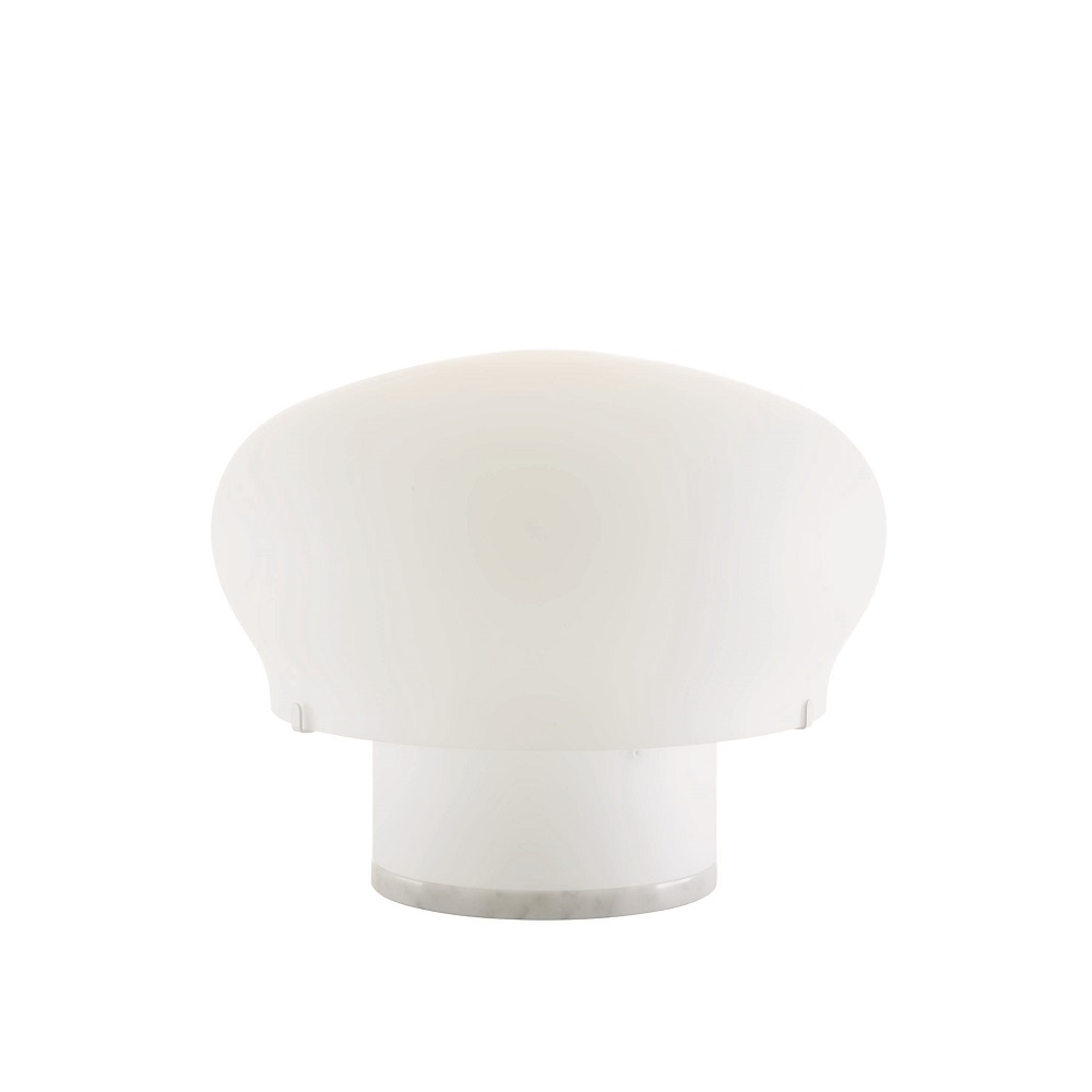 There is a real Italian colouration to this Fifties-inspired light. A plush light with a ? radical ? look, with the post-war predilection for materials. It recalls the Italian masters of ? Línea Italiana ? (a good Italian design), the work of Magistrati and Gio Ponti. – Table lamp : glass shade ? 48 cm H 25 cm in satin-finish opal mouth-blown glass (as per the floor lamp), mounted on a cylindrical base ? 24.5 cm H 12.5 cm, also in satin-finish opal mouth-blown glass. – Base in Carrara marble ? 25 cm, thickness 20 mm, – Transparent PVC cable. Transparent manual switch. – 330° 14 W E 27 standard LED bulb, colour temperature 2,700K (warm white), 1,250 Lumens ; ECLapproved. – Energy class A+ – Compatible with bulbs of energy classes E to A++.