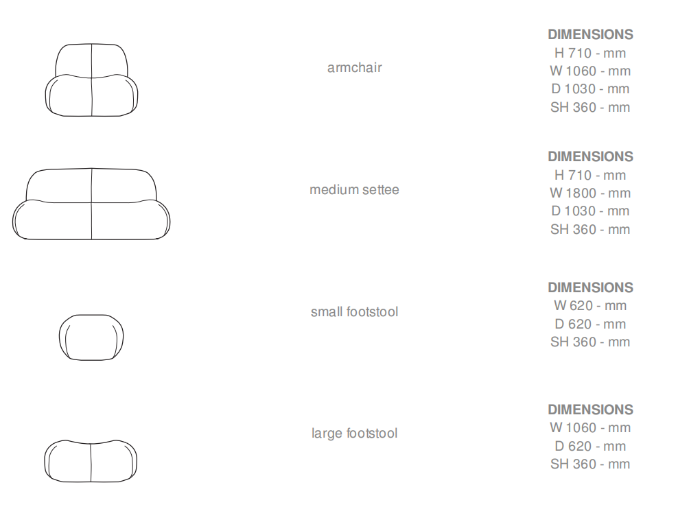 富有創(chuàng)意的產(chǎn)品,為眼睛和臀部帶來極大享受。普卡系列非常舒適,是設(shè)計上的奇跡,其起源可追溯到偉大的 C&B時代,當(dāng)時Gaetano Pesce于1969年推出了UP50系列,他創(chuàng)造了一個向海綿致敬的系列,Gaetano Pesce 說自己被淋浴間的海綿迷住了,因?yàn)樗偸悄芑氐皆瓉淼男螤睢?雅布·卜舍勒貝爾(Yabu Pushelberg)秉承了這一主題,增添了女性化、柔軟和有機(jī)的設(shè)計,使空間充滿感官舒 適感。 與雅布和卜舍勒貝爾的新合作將其先進(jìn)的設(shè)計理念與我們的制造技藝相結(jié)合。接縫的細(xì)節(jié),超柔軟泡沫的使用以 及線條的張力使我們不得不考慮使用完美的布料,而只有我們最具彈性的面料:Arte、Maxi、Gentle、Moby和 Appa才有可能滿足制作要求。特別是新型的Gentle面料,它是100%有彈力的羊毛織天鵝絨,能完美符合設(shè)計要 求。 結(jié)構(gòu):不同密度的泡沫,底座由高彈性的聚氨酯泡沫(48 kg / m3 -7.1 kPa)制成。 舒適度:靠背由高彈性的Bultex聚氨酯泡沫(26 kg / m3 -1.4 kPa)制成,并覆蓋有超柔韌性的聚氨酯泡沫(50 kg / m3 -1.8 kPa) 座椅由高彈性的聚氨酯泡沫Bultex制成(38 kg/m3 - 3,6 kPa 和 38 kg/m3 - 2,8 kPa),上覆蓋超柔軟的聚氨酯泡 沫(50 kg/m3 - 1,8 kPa) 。 縫紉/罩布:應(yīng)該選擇具有彈性的面料 可由專業(yè)人士拆卸