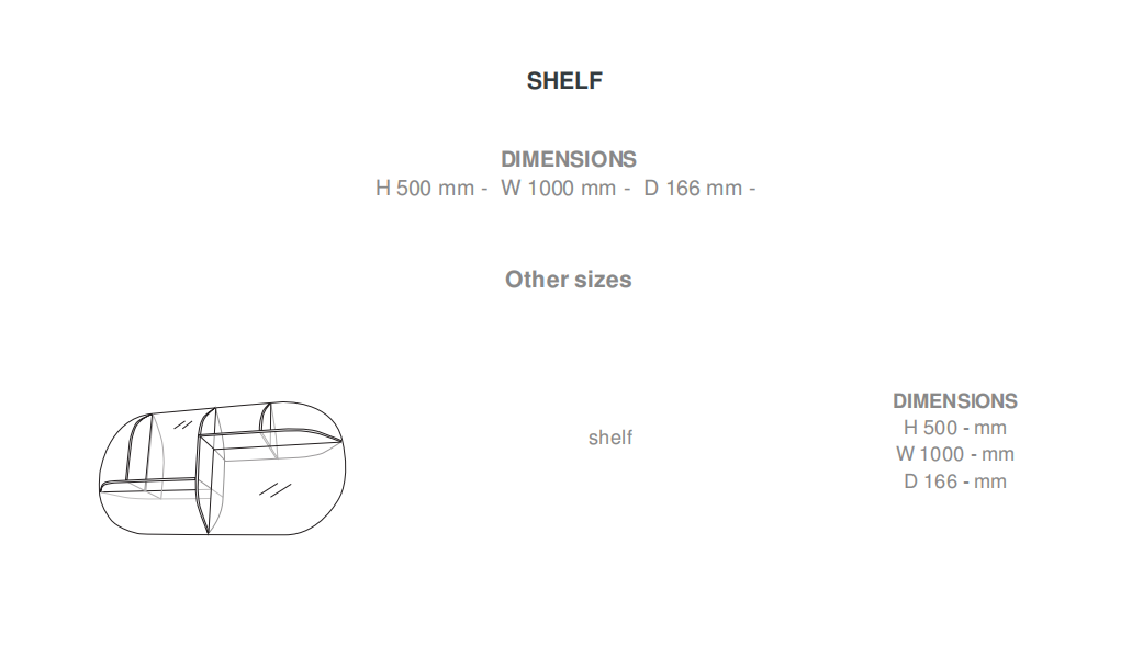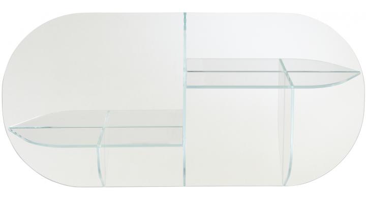 Shelf comprising a mirrored glass backing and shelves in 8 mm thick ‘cristal’ glass. There are 2 battens on the back which enable it to be hung either horizontally or vertically. Max. load per shelf : 2 kg.