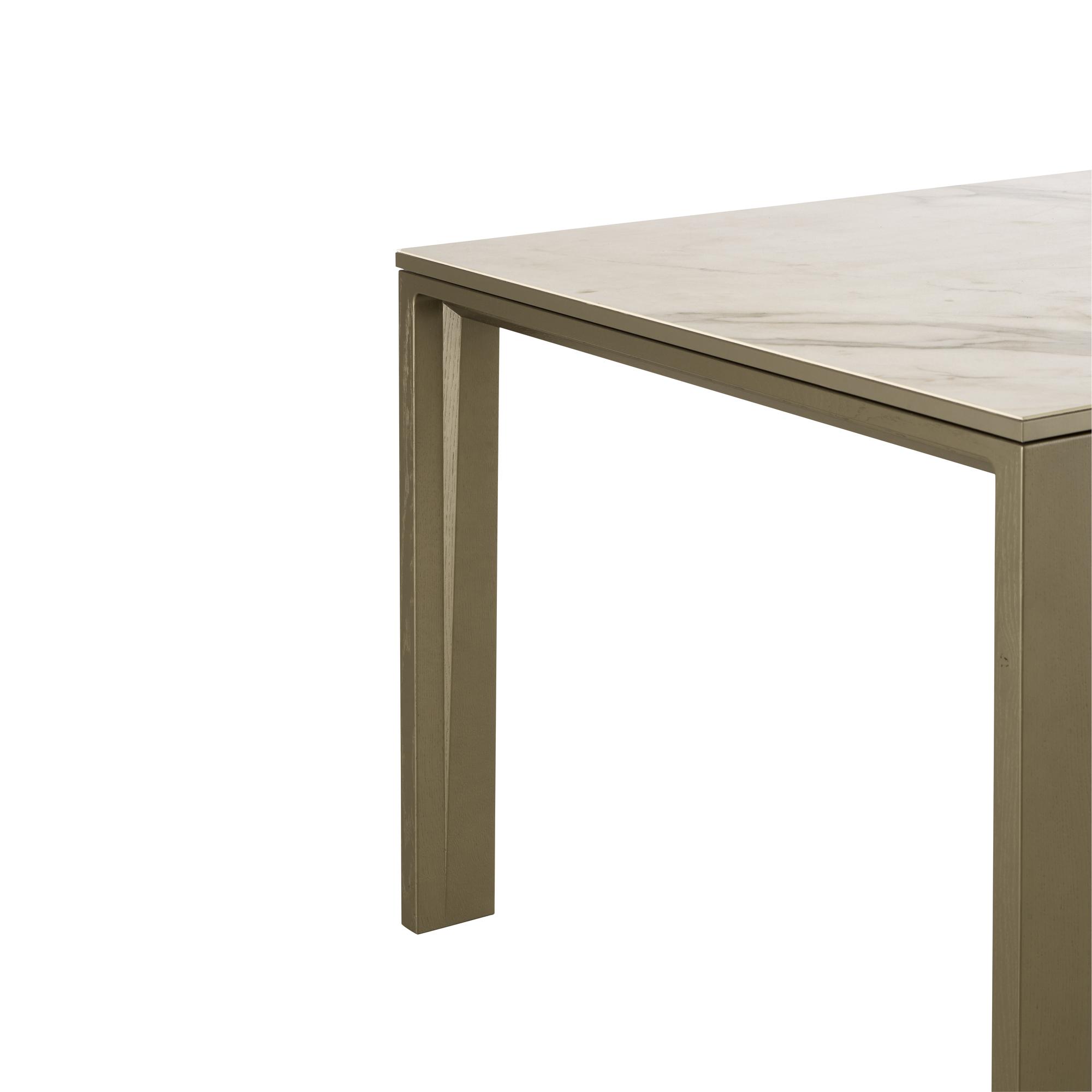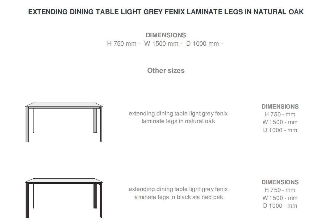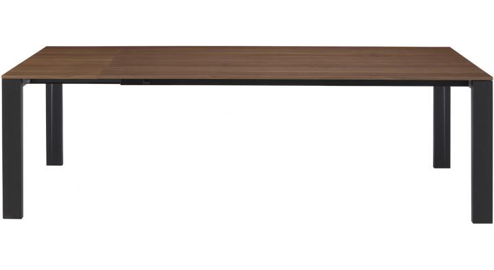 Dining tables with one integral W 75 cm extension (or with 2 integral W 50 cm extensions). Base in moulded black-stained solid oak with 16 mm thick MDF top finished in natural or black-stained oak veneer, walnut veneer, dark-toned walnut veneer or 9/10 Fenix (choice of noir or gris clair); or in solid natural oak with top in natural oak veneer or 9/10 Fenix (choice of noir or gris clair). The top is in one piece : just pull at one end of the base to enage the folding extension located at the end of the table. The extension is matched to the top.