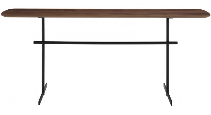 Table/sofa end table which can slide alongside the Prado settee. Satin black lacquered steel base ; top in satin- finish natural varnished solid American walnut.