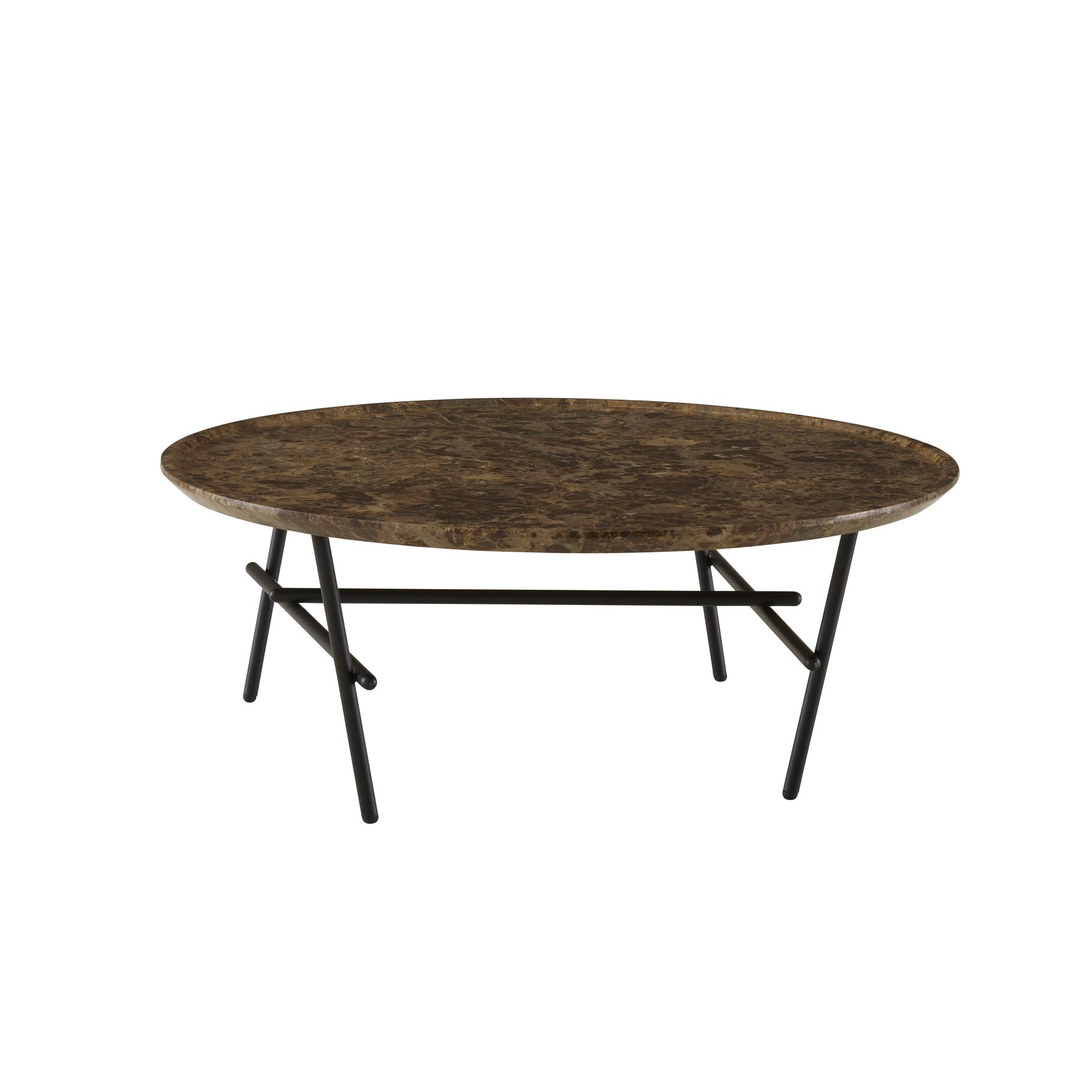 Making a play with the chaotic appearance of the steel structure of its base, the Yuragi table is at once simple and complex. Designed for indoor use, it is available with a top in verde Indian marble, marron Emperador marble or black Marquina marble. A modern, attractive design. The top is machined to obtain the border around the edge. Low table comprising a top (thickness 25 mm) in brilliant-polished marble with stain-resistant treatment and a satin black lacquered steel base with black semi-spherical gliders.