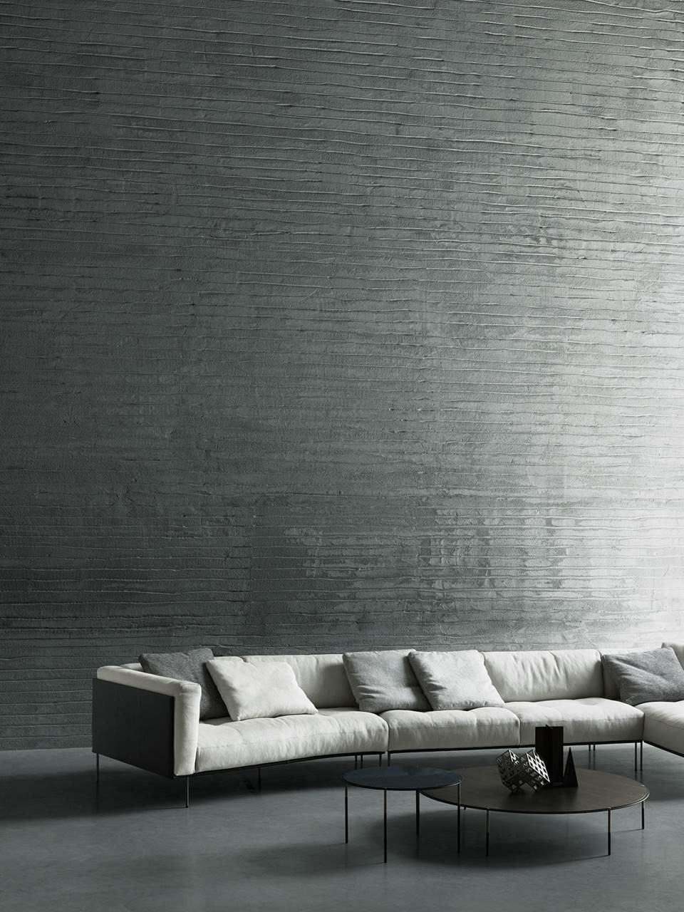 Supporting structure in lacquered drawn tubular steel, seat sprung with coated rubber elastic straps and polyurethane foam. Backrest and armrest structure in self-supporting decorative HPL panel. Covering in 100% polyether, thermally bonded onto a polyamide velveteen backing. Backrest and seat cushions in prewashed and sterilized goose down, with polyurethane foam insert. The seat cushions are quilted with buttons at sight or, on request, quilted without buttons. Armrest cushions in polyurethane foam covered with prewashed and sterilized goose down, with a poplar plywood supporting panel fixed to the frame by plug-in hinges. Stainless steel feet, polished or matt satin-finish, screwed to the base with a bushing. Fabric or leather upholstery, both fully removable by zippers and Velcro fastenings.