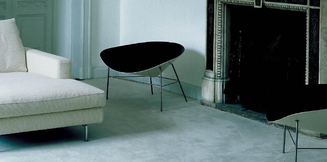 Armchair with preformed shell in birch plywood, natural finish, or lacquered in black or white. Covering in leather or hide. Supporting base in AISI 304 stainless steel tube with matt-satin finish. Seat depth 48cm.