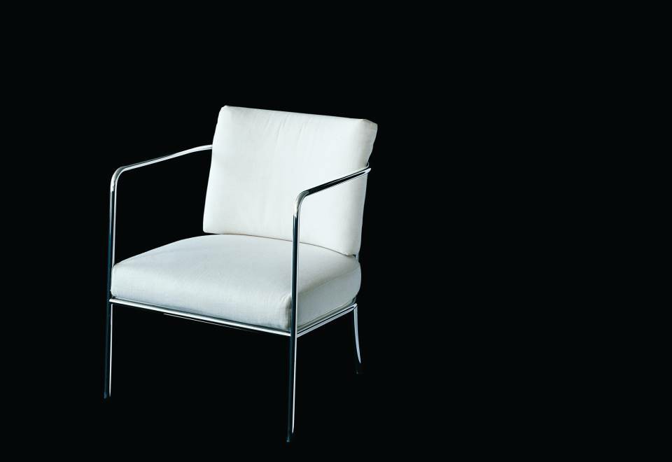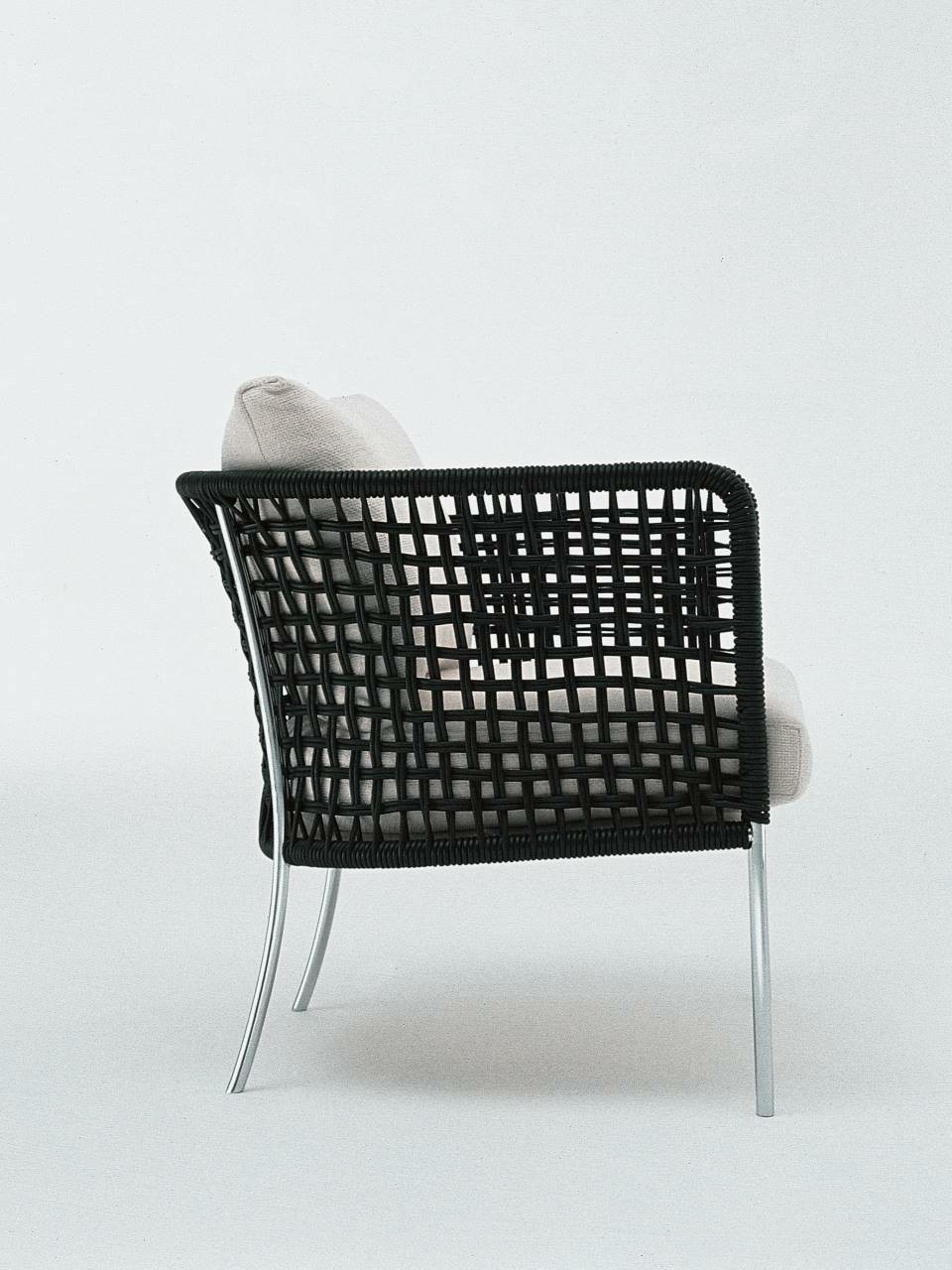 Small armchair available for indoor and outdoor. Indoor: tubular steel frame with chrome finish or AISI 316 stainless steel with matt satin-finish. Seat chassis in lacquered steel with padding in differentiated density polyurethane foam, for chromed version; self-supporting decorative HPL plastic laminate panel for AISI 316 stainless steel version. Fabric or leather upholstery, both fully removable by zippers, after unscrewing the seat chassis from the frame (chrome version). Woven with coach-hide, hempen rope or PVC profile in the colours of our collection. Seat cushion with preformed, differentiated density polyurethane foam structure, coated with acrylic fibre layers, backrest cushion in prewashed and sterilized goose down, stitched into separate compartments; in the Cafè Light version, backrest cushion always in differentiated density polyurethane foam structure, coated with acrylic fibre layers. Outdoor: frame in AISI 316 stainless steel with matt satin-finish. Seat in self-supporting decorative HPL plastic laminate panel. Woven with PVC profile, in the colours of our collection. Seat and back cushions padded with open cell structure polyurethane foam FILTREN?T covered with fibre for outdoor and upholstery with outdoor fabrics only, fully removable by zippers. Seat depth 45cm.