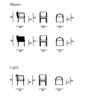 Armchair available for indoor and outdoor. Indoor version: tubular steel frame with chromed finish or in AISI 316 stainless steel with matt satin- finish. Seat panel in tubular steel with epoxy powder coating, padded in polyurethane foam (for chrome version) or in self- supporting decorative HPL plastic laminate (for AISI 316 stainless steel version). Fabric or leather upholstery, both fully removable by zippers, after unscrewing the seat panel from the frame (for chrome version). Woven with hide, hempen rope or PVC profile in the colours in collection. Seat cushion in preformed differentiated density polyurethane foam, covered with acrylic fibre layers. Backrest cushion in prewashed and sterilized goose down, stitched into separate compartments. For the Light version, backrest cushion, always in polyurethane foam coated with acrylic fibre layers. Outdoor version: tubular steel frame in AISI 316 stainless steel with matt satin- finish. Seat panel in self- supporting decorative HPL plastic laminate. Woven in PVC profile in the colours in collection. Seat and backrest cushions padded with open-cell structure polyurethane foam and covered with fibre for outdoor. Upholstery with outdoor fabrics only, as per chart on pg.43, fully removable by zippers. For both versions seat and backrest cushion’s upholstery are joined together by sew 59 ing. 59 59 5