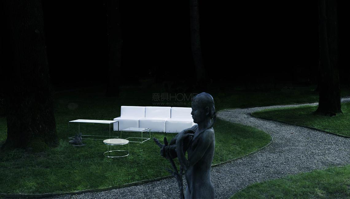 Small armchair available for indoor and outdoor. Indoor: seat frame in plywood, back panel in steel. Padding in differentiated density polyurethane foam. Covering in 100% polyether thermally bonded onto a polyamide velveteen backing. Fabric or leather upholstery. Outdoor: seat frame in marine plywood, back panel in steel. Padding in fine cell polyethylene. Upholstery with outdoor fabrics only. Both versions with black PVC feet or, on request, available on wheels and fabric upholstery only, fully removable by zipper and Velcro fastenings. Seat depth 46cm.