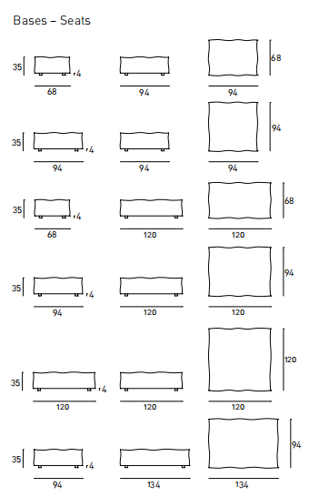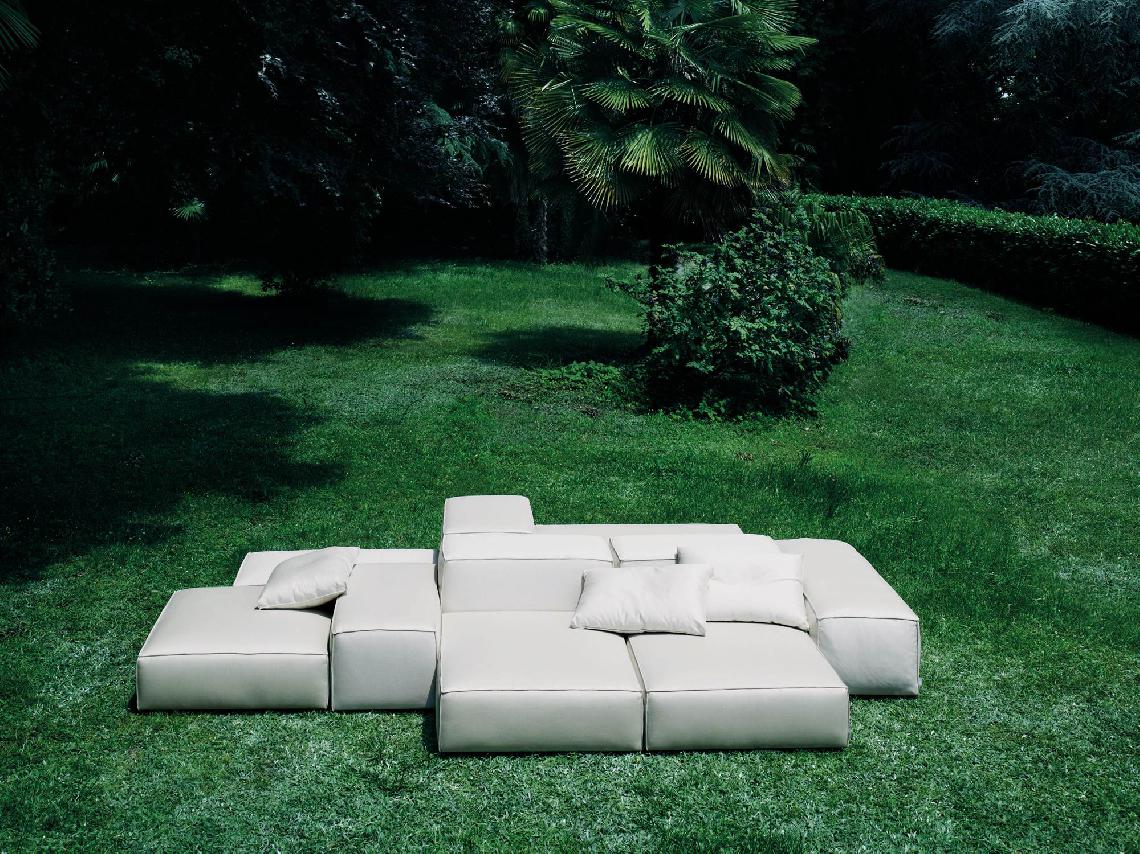 Modular elements of different dimensions available for indoor and outdoor. Indoor version: frame in double-paneled poplar and pine. Support in cross-woven coated rubber elastic straps. Padding in differentiated density polyurethane foam covered with a quilted mat in prewashed and sterilized goose down, stitched into separate compartments or, on request, padding in differentiated density polyurethane foam with a mat covered with acrylic fibre layers. Fabric or leather upholstery, both fully removable by Velcro fastenings. Outdoor version: frame in steel lacquered for outdoor for bases and in steel lacquered for outdoor and plywood for outdoor for backrests and armrests. For bases only, support in cross-woven, coated rubber elastic straps and hooks in Stainless Steel for outdoor. Padding with open cell structure polyurethane foam DRYFEEL S, with a quilted mat in fibre for outdoor covered with waterproof fabric protection. Upholstery with outdoor fabrics only, fully removable by Velcro fastenings. Both versions are with black adjustable PVC feet. The various elements are joined together by means of hooks. Seat depth 68-94-120-134cm.