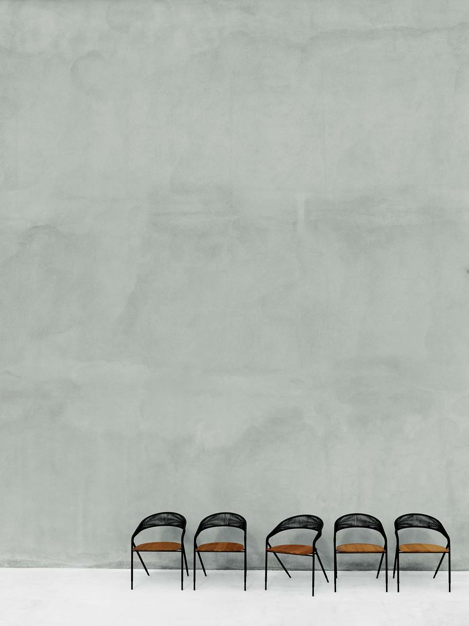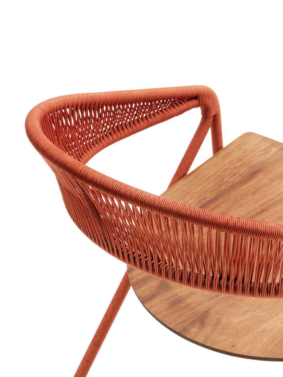 Dining chair available for indoor and outdoor in both Light version (only frame) and woven in the finishing available in our collection. Indoor: supporting frame in tubular and steel rod section ?16mm coated with epoxy powder finish RAL-K7 9017 matt black. Weave in natural wicker (? 3 mm) toasted and finished with a transparent varnish, profile in hide (? 2,5 mm) or waxed rope (? 2 mm). Seat, made of 5 slats glued together, in natural or charcoal- dyed solid ash wood with water-based acrylic paint finish. Outdoor: supporting frame in tubular and steel rod section ?16mm coated with a galvanizing base for outdoor and epoxy polyester powder finish RAL-K7 9017 matt black. Weave in waxed rope (? 2 mm) and seat, made of 5 slats glued together, in solid Iroko wood. Floor support secured by plastic feet.