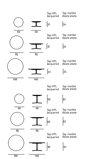 Table in different heights and sizes, available for indoor and outdoor. Indoor: 4 legs base in chromed-plated steel or AISI 316 stainless steel with matt satin-finish. Top in decorative multi-layer HPL, decorated on both sides, white or black; in MDF white or black lacquered; in white Carrara marble, black Marquinia marble or Slate stone. Outdoor: 4 legs base in AISI 316 stainless steel with matt satin-finish. Top in decorative multi-layer HPL decorated on both sides, white or black, or Slate stone. In both versions, the base for tops ?85cm or ?100cm with 72/74cm height has 5 legs.