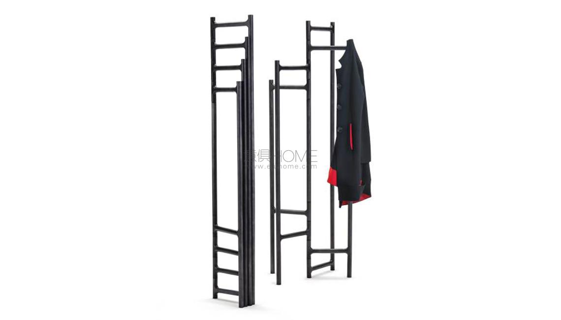 Coat- hanger composed by four “C-shaped” elements, of various heights, joined together by means of a central pin that, thanks to a “compass” opening, allows to place each element in various positions; the minimum recommended opening angle between elements is 90°. The structure, realized by a CNC machine, is in solid ash wood, ?30 mm, with acrylic painting finish; natural colour with acrylic water based finish, or charcoal dyed with acrylic base and acrylic painting finish. The spacer rings, ? 30mm, placed between each element, are in black phosphate coated steel. Floor support secured by plastic feet.