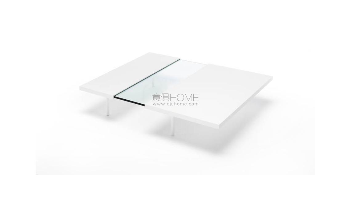 Extendable coffee table made of a supporting tempered glass top, 12mm thick, contained in two “shells” made in “folding” of aluminum honeycomb panels, pre-lacquered RAL-K7 9010 white or anodized. The lower part of the aluminum panel is milled to allow the inset of the legs, which are screwed to the glass top with a bushing. The shells are fitted with runners in a self-lubricating material, to allow them to slide.