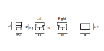 Bedside table with supporting frame in “folding” of MDF 15mm thick veneered with elm or Thermo oak plates with water-based acrylic paint finish. Legs in solid oak ?30mm, each with different height: 15, 25 and 35cm. Front panel in 15mm thick MDF veneered with elm or Thermo oak plates, with pull-out natural birch drawer on Blum? runners, with two compartments of different height and volumes, and one trinket drawer. Available in right and left version.