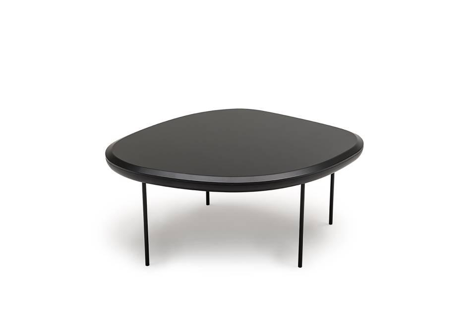 Family of small tables with organic shapes, with monobloc top composed of a bevelled top available in MDF lacquered matt black or in marble, screwed to the lower edge of the top in MDF always lacquered matt black, fitted with fixing bushes to screw the tubular steel feet ?12 mm lacquered with epoxy powder coating gunmetal grey colour. Floor support secured by black PVC feet. Tops in marble, available in white Carrara, red Levanto, black Marquinia and Sahara Noir, with a satin finish and a matt transparent protective varnish or with matt or glossy polyester finish.