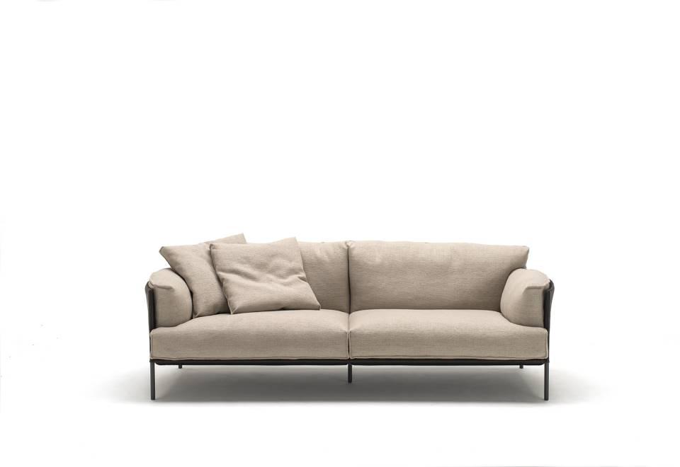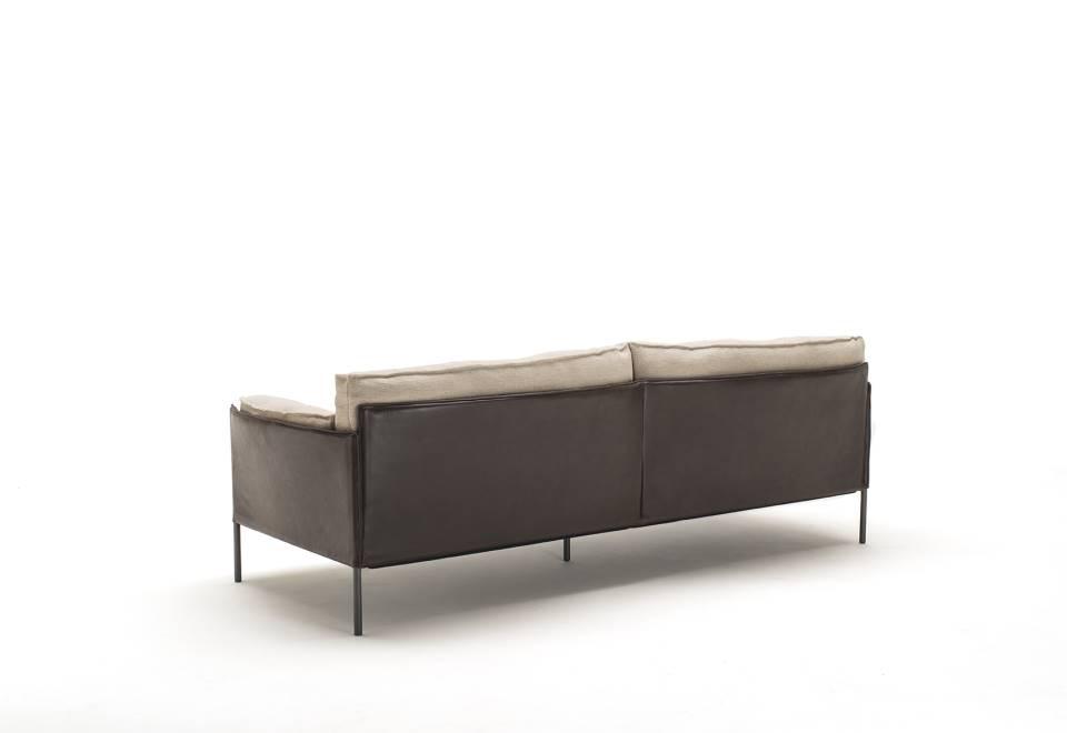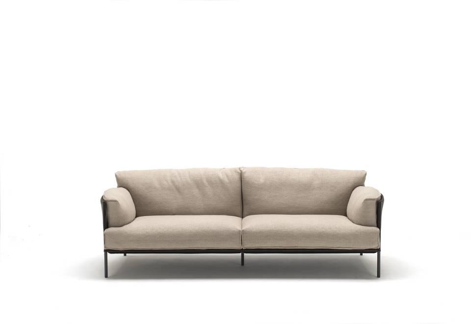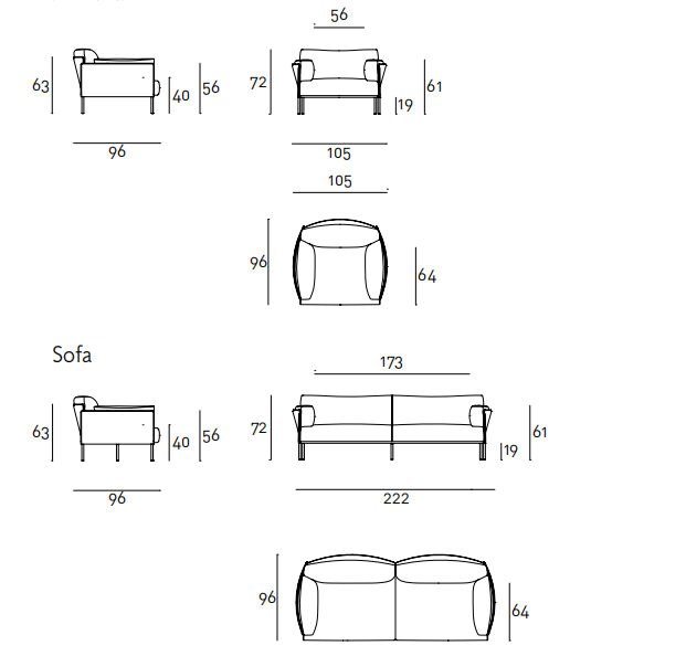 Sofa, available in fix measures 222/271/320cm, depth 96cm  and armchair 105cm depth 96cm, with supporting structure in  lacquered tubular steel, 60x30mm section, seat sprung with  coated rubber elastic straps and polyurethane foam.  Backrest and armrest structure in tubular steel embedded  in cold- expanded polyurethane foam with covering in 100%  polyether, thermally bonded onto a polyamide velveteen backing,  screwed to the supporting structure. Seat, armrests and backrests cushions in prewashed and  sterilized goose down, stitched into separate compartments,  with performed polyurethane foam insert.  Steel rod feet ?22mm, screwed to the backrest structure with a  bushing, welded within the structure and seat cushions support  bar, in ?20mm steel tube, fixed to the base by screw-spacer,  with gunmetal grey epoxy powder coating.  Floor support secured by adjustable black PVC feet. Cushions upholstery in fabric or leather, both fully removable by  zippers and Velcro fastenings; backrest and armrest structure  upholstery removable by Velcro fastenings for the fabric version  only, while always fix when in Cuoietto or leather. Seat depth 64cm.