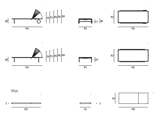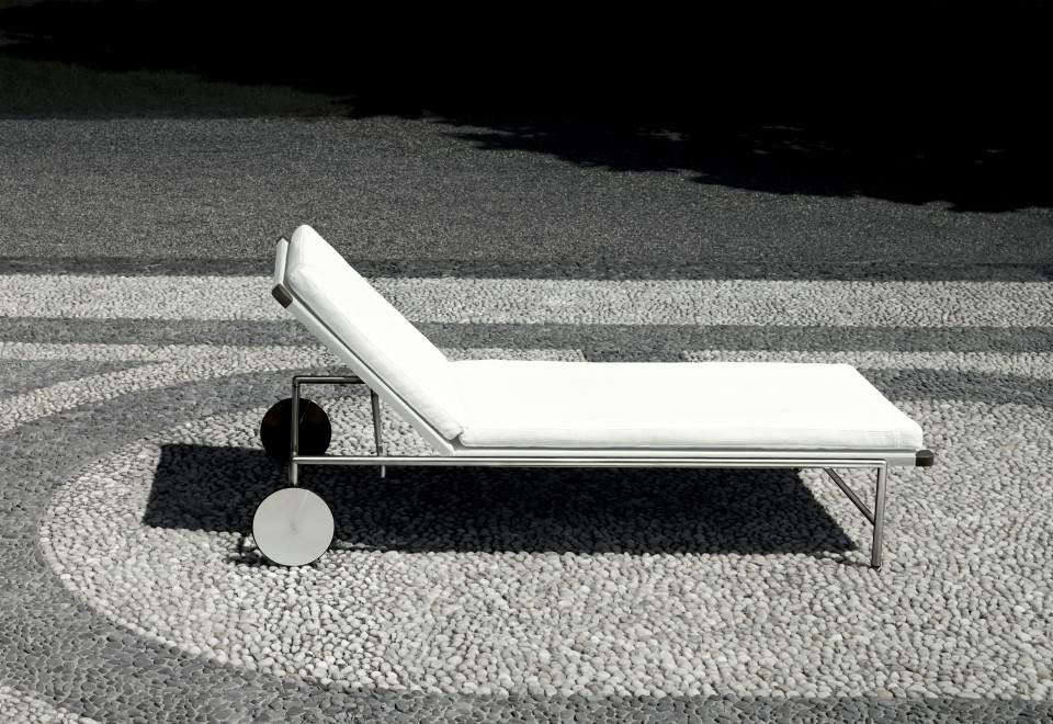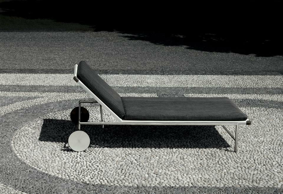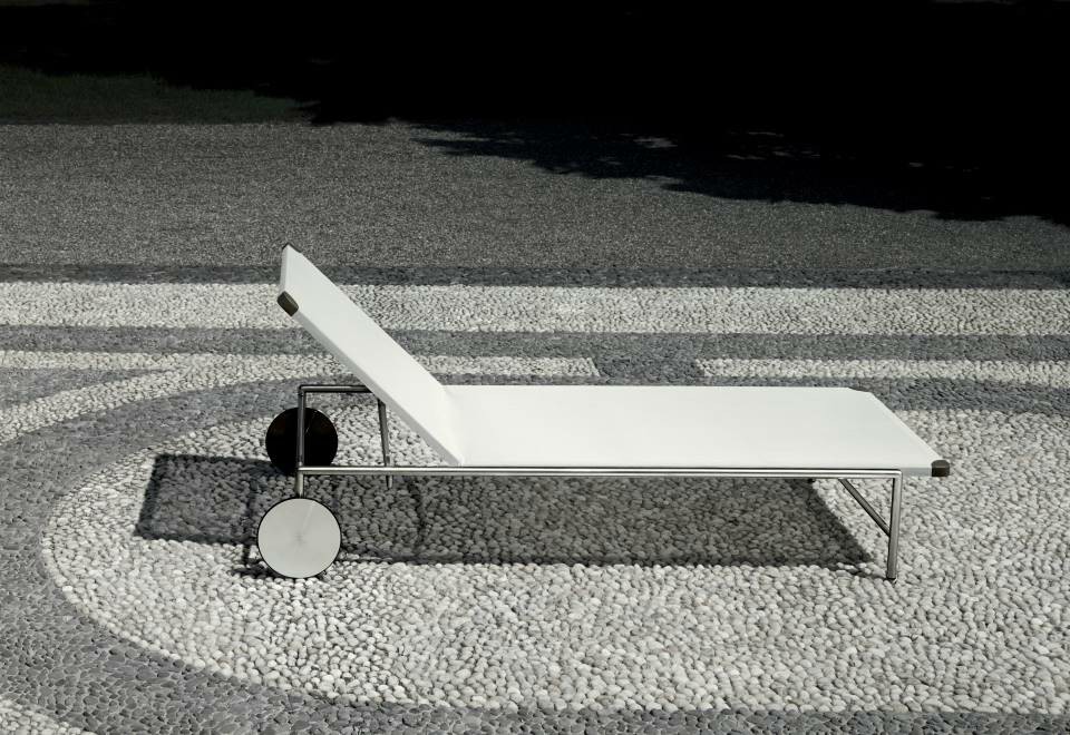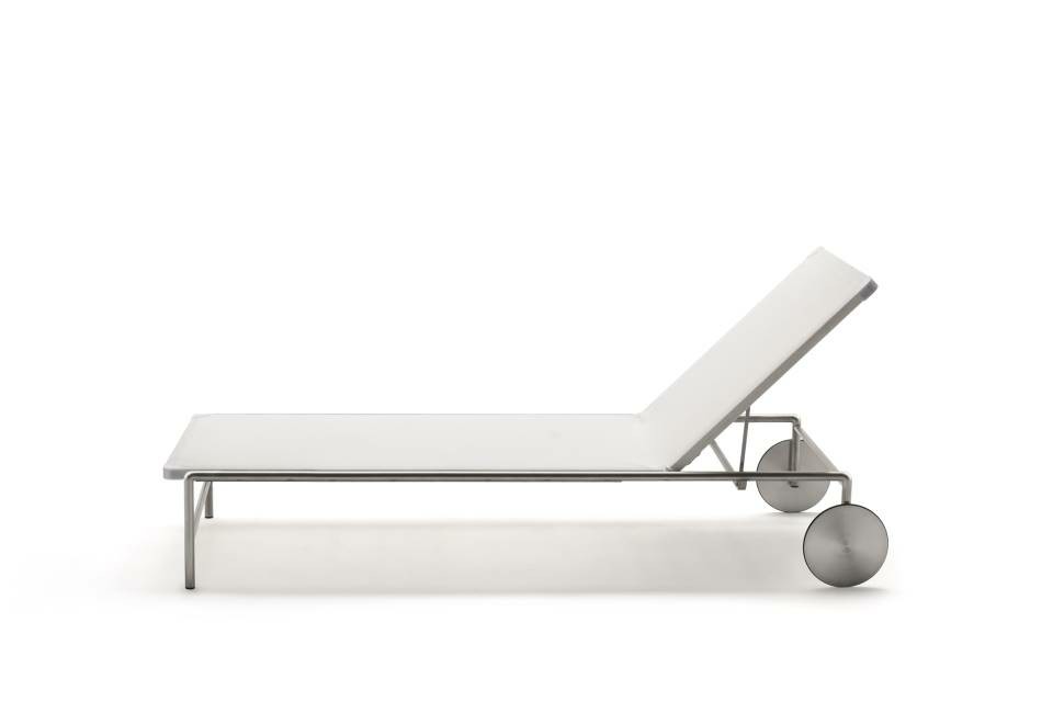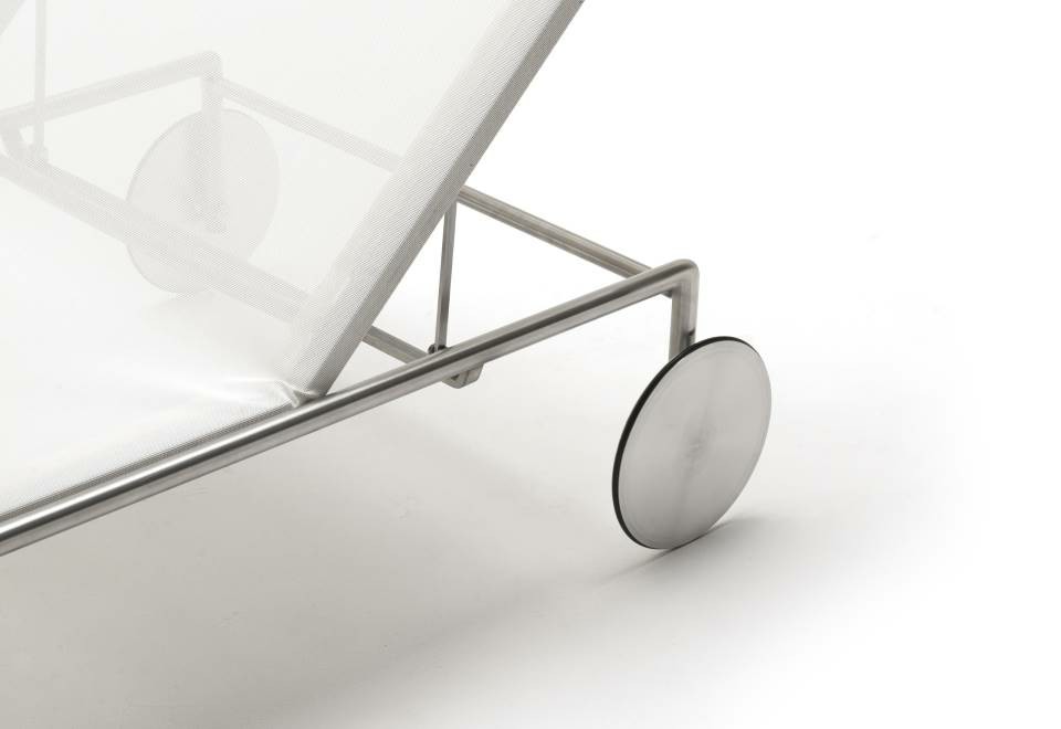 Sunbed, available with or without wheels, with supporting frame in ?25 mm tubular stainless steel AISI 316 with matt satin finish; wheels, placed at the back, in stainless steel sheet AISI 316, externally covered with thermo-stamped rubber and floor support secured by black PVC feet. Seat and backrest chassis in tubular stainless steel AISI 316, section 25x25 mm, with fix upholstery in white technical fabric. Height adjustable backrest with mechanism allowing 5 different positions. Corner covers in thermoplastic material. Mat available in polyurethane foam DRYFEEL S covered with fibres for outdoor and with a heat-sealed waterproof fabric cover. Mat upholstery in outdoor fabrics only, fully removable by zippers.