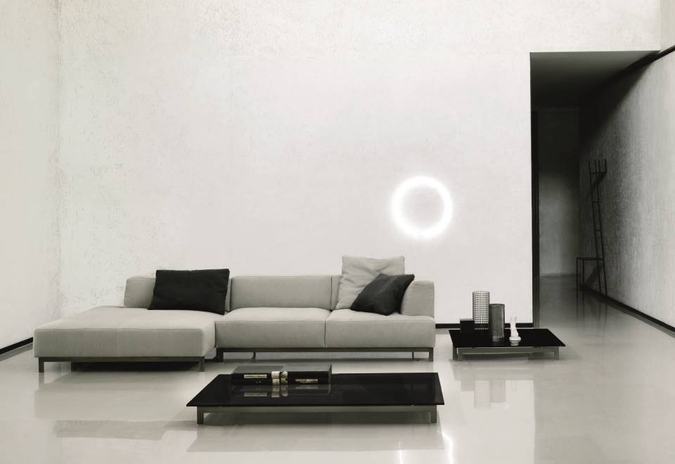Low table with rectangular section steel base with finishing in burnished epoxy powder coating and floor support secured by black PVC tips. Top in tempered glass, available versions: clear glass, black back-painted glass, smoked glass or white back-painted extra-clear glass.