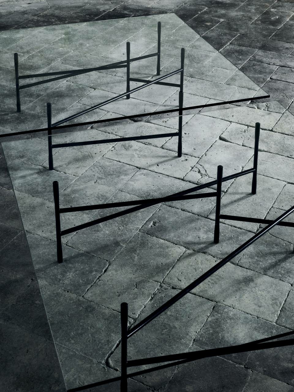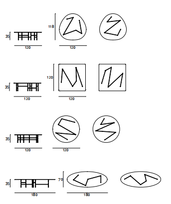 Coffee table available with four different tops of 12mm shaped clear tempered glass. Each glass can be used with two different structure combinations. Base made of ?20mm lathe-tapered steel bars of 35cm height and ?16mm steel tubular spacers, in sizes 30/60/90cm, to be combined to obtain different configurations. Epoxy powder coating in RAL- K7 9010 white, RAL- K7 9017 black or gunmetal gray colour. The table, packaged as a kit, should be assembled following the instruction attached.