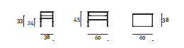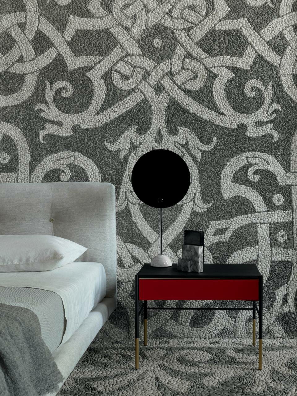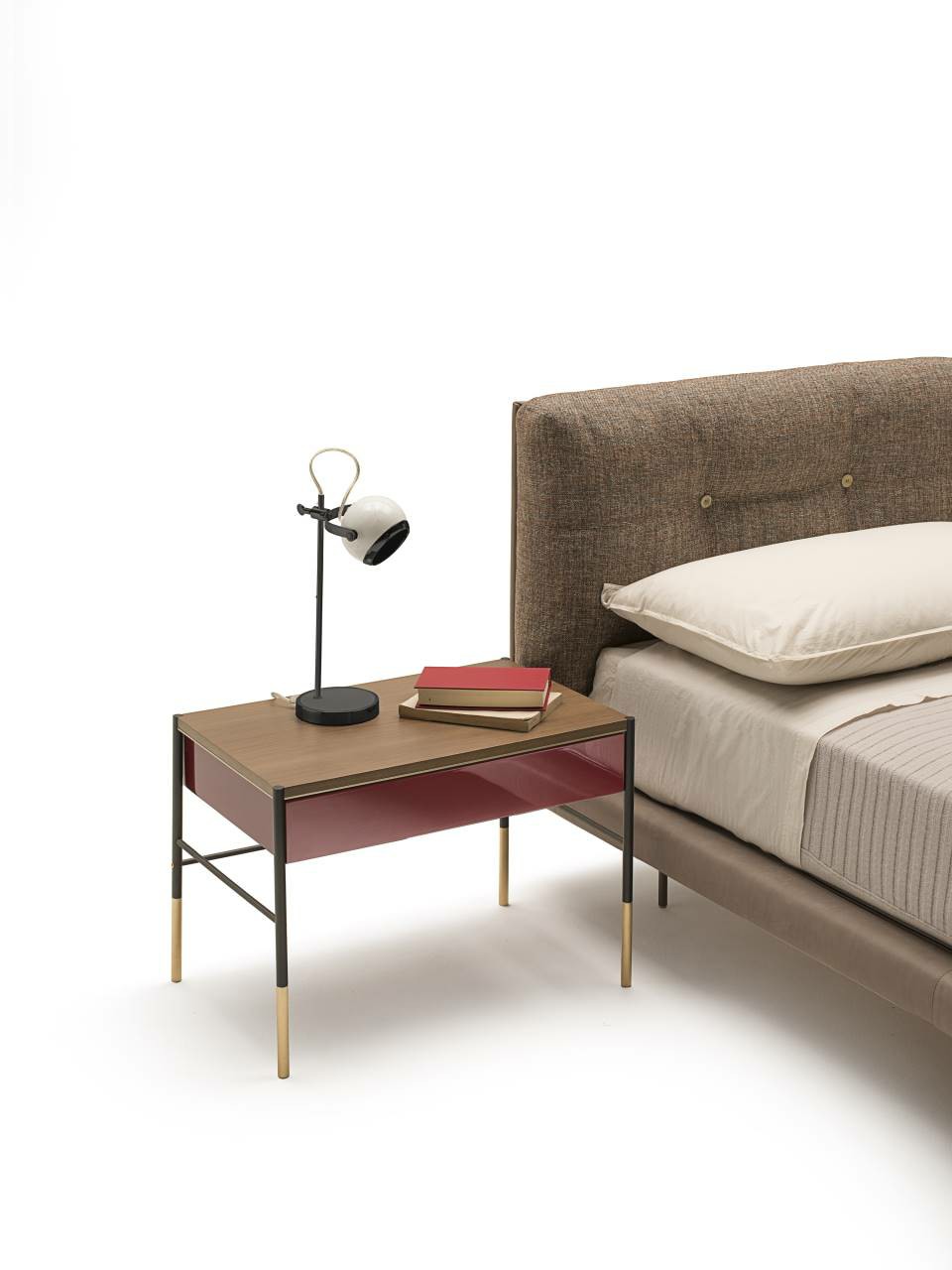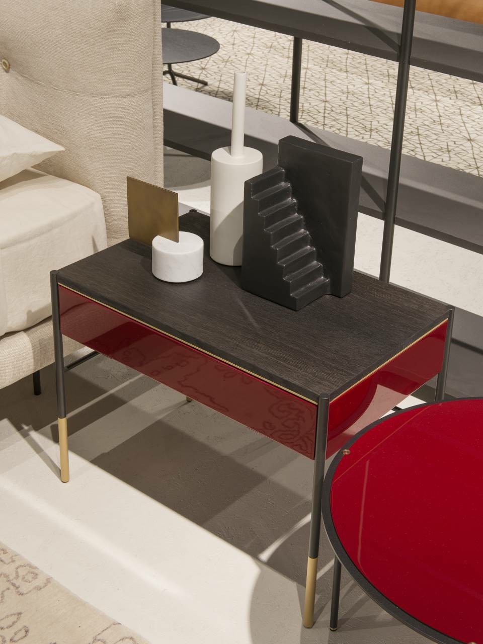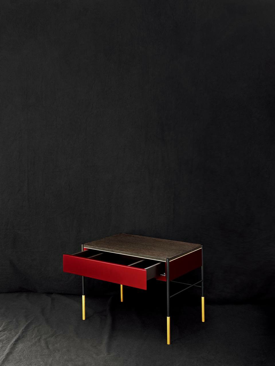 Bedside table consisting of a central part in MDF lacquered in matt black and frontal external parts in MDF veneered in Stone Oak? or walnut lacquered ‘Canaletto’ or polish in glossy finish RAL-K7 3005 Red Wine, RAL-K7 5020 Ocean Blue,  RAL-K7 7030 Stone Grey, RAL-K7 7039 Quartz Grey or RAL-K7  9001 Cream, with drawer on Blum? runners, with three  compartments of different heights and volumes. MDF top  thickness 18 mm, paired with a 3 mm thick brass sheet frame,  veneered in Stone Oak?  or walnut lacquered ‘Canaletto’, coupled with the body of  the drawer by means of bushes and pins. Brass feet screwed to  the ?16 mm round steel legs, with integrated fastening elements,  connected to each other by steel rods ?10 mm.  Floor support secured by black PVC feet. All metal parts are coated with epoxy powder gunmetal grey  colour and brass elements are satinized and finished with a  transparent matt varnish.