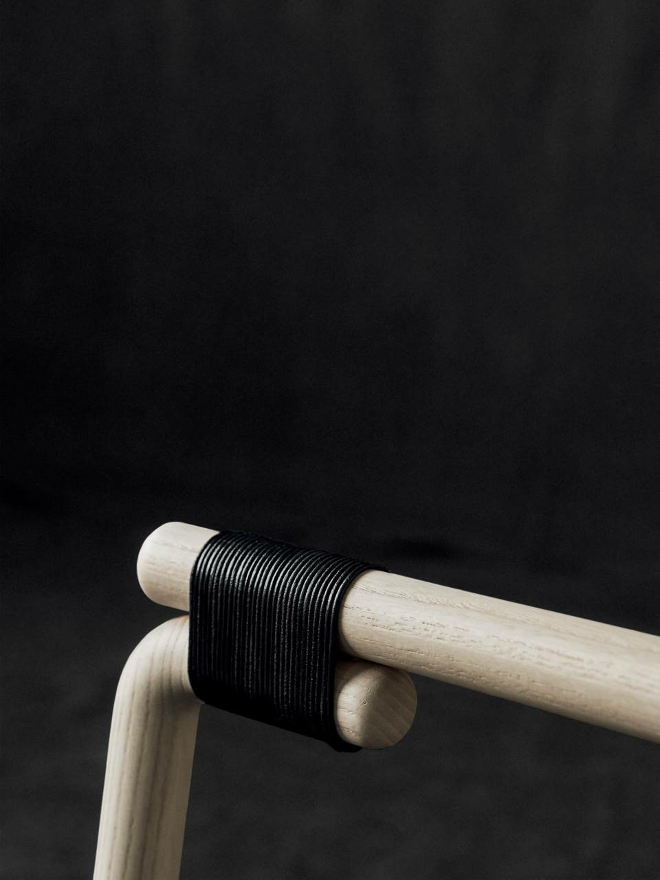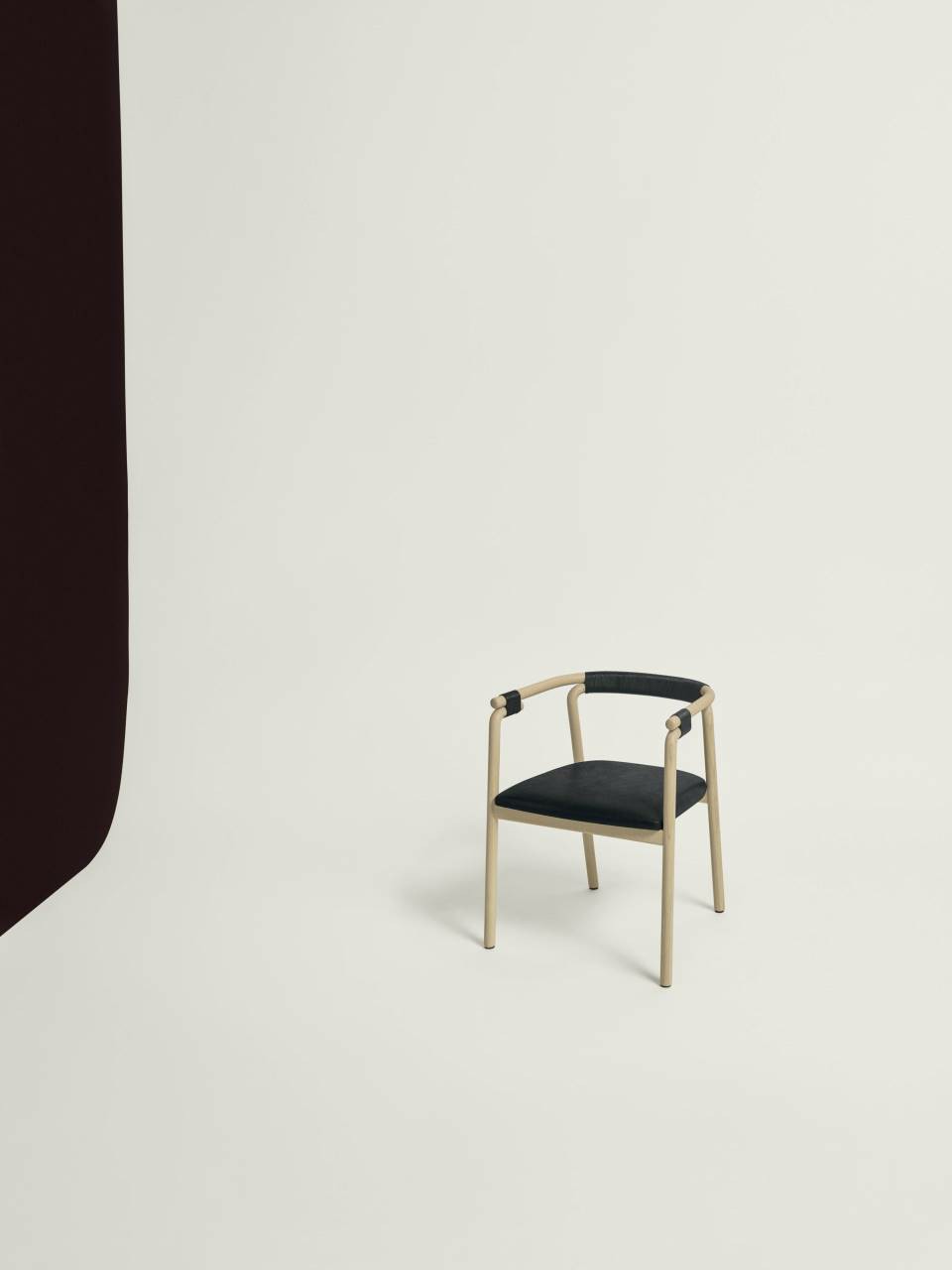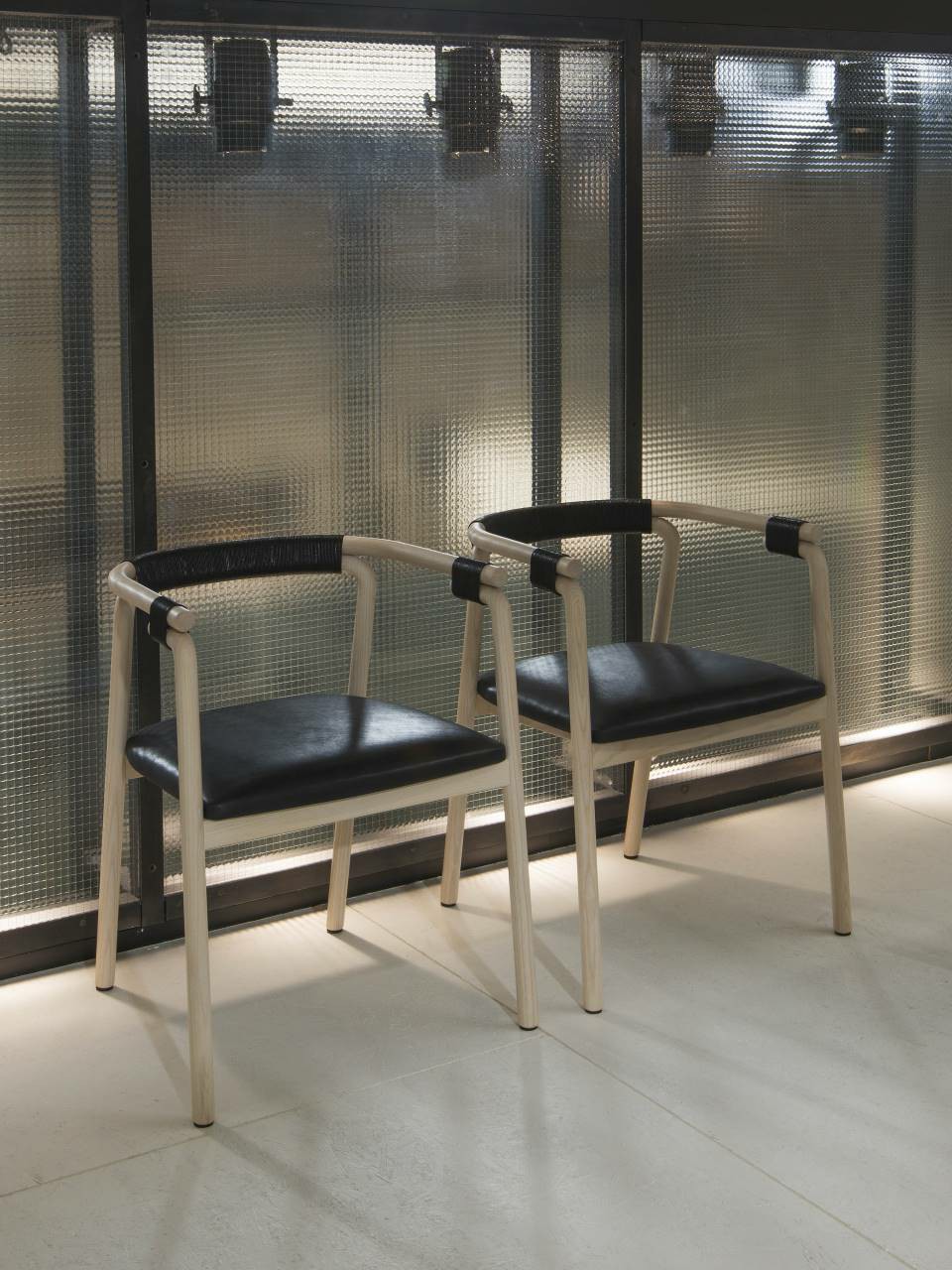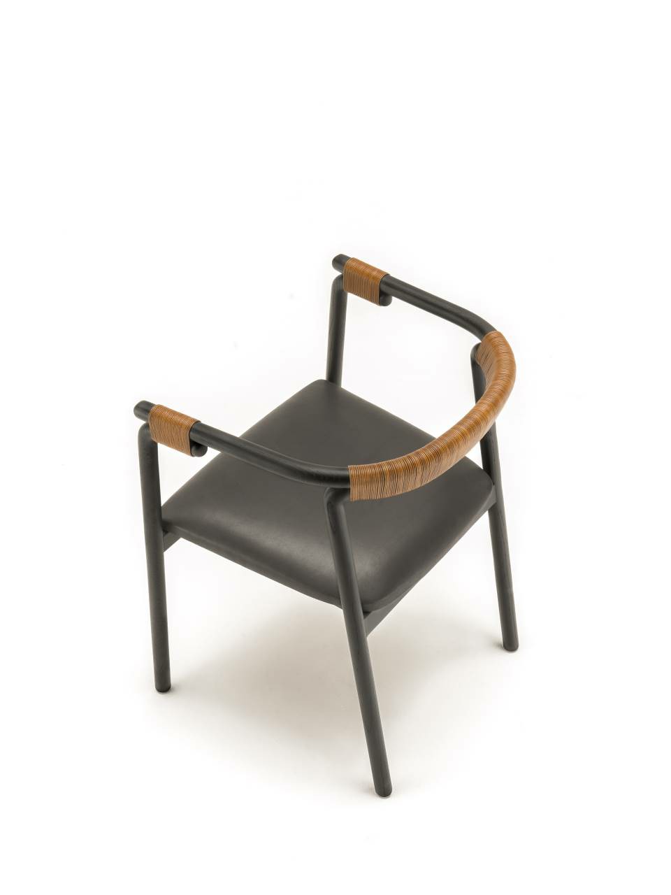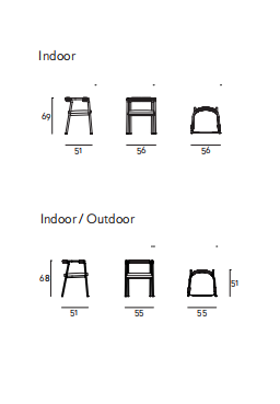 Chair available for indoor and outdoor. Indoor version: in solid ash wood ?30 mm with acrylic painting finish natural colour and with acrylic water-based finish, or charcoal-dyed, with acrylic base and acrylic painting finish. Seat chassis in multilayer sprung with coated rubber elastic straps, padded in polyurethane foam covered with acrylic fibre layers. Indoor/Outdoor version: with tubular frame ?22 mm in stainless steel AISI 316 lacquered with epoxy powder coating gunmetal grey colour; seat chassis in plywood for outdoor use, sprung with coated rubber elastic straps, padded in open cell structure polyurethane foam DRYFEEL S covered with fibres for outdoor and with a heat-sealed waterproof fabric cover. Decorative weave for backrest and armrests with profile in hide cellulose cord or waxed rope for outdoor use, in the colours of collection. Non-removable seat upholstery in fabric or leather; for the outdoor version, in outdoor fabrics only. Floor support secured by black PVC feet.