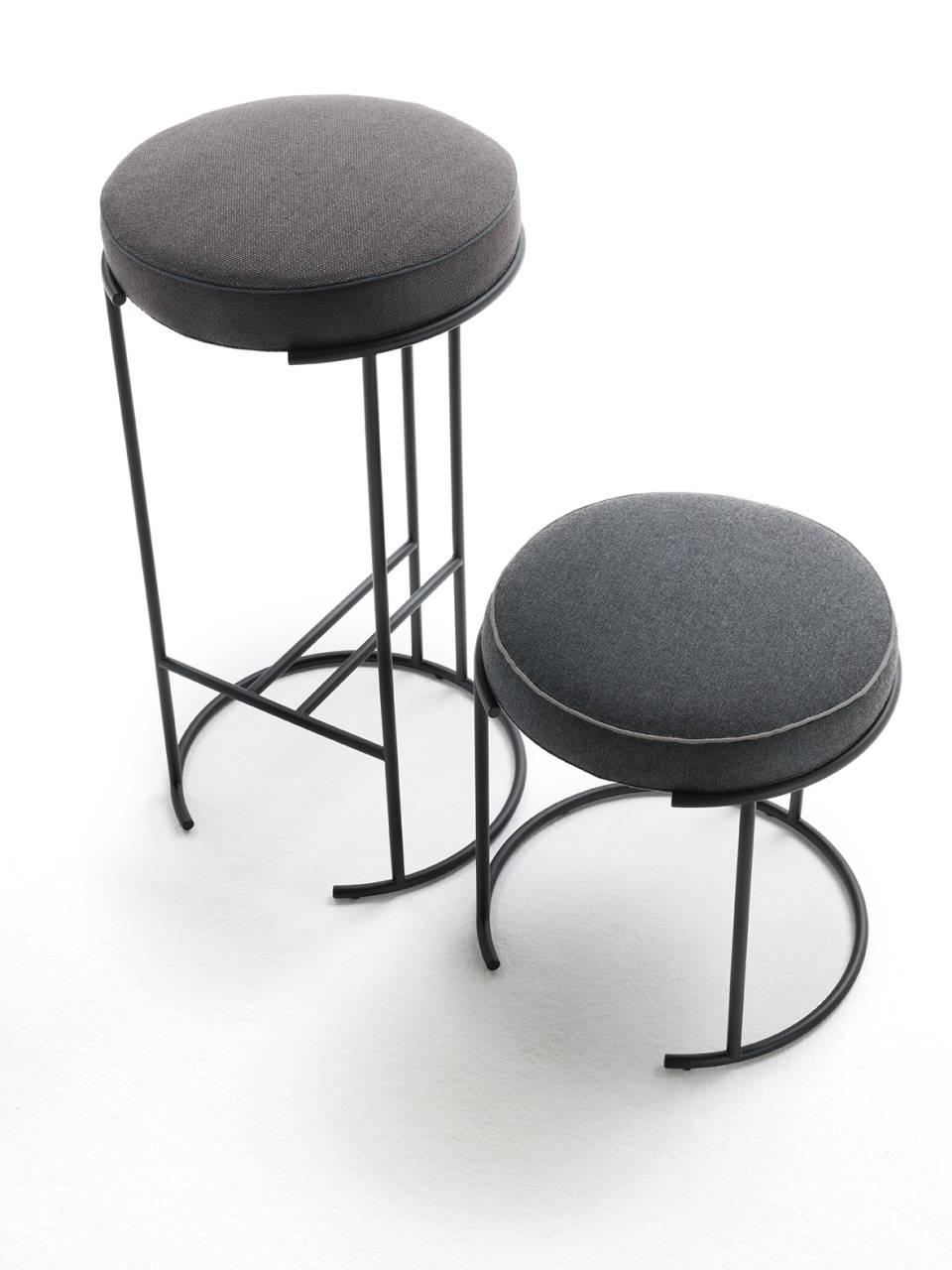 Stool available in three heights for indoor and outdoor. Indoor version: supporting frame in steel rod section ?12mm coated with epoxy powder RAL- K7 9017 matt black. Seat panel in multilayer poplar wood and padding in polyurethane foam and acrylic fibre layers. Fabric or leather upholstery with grosgrain piping when in fabric, and when in leather piping in the same finish as the seat. Outdoor version: supporting frame in Stainless Steel AISI 316 rod section ?12mm coated epoxy polyester powder finish RAL- K7 9017 matt black. Seat panel for outdoor plywood and padding in open cell structure polyurethane foam DRYFEEL S covered with fibre for outdoor and with a heat-sealed waterproof fabric. Upholstery with outdoor fabrics only. For both versions fully removable upholstery by Velcro fastenings, unscrewing the chassis from the supporting frame, and ground support secured by plastic feet.