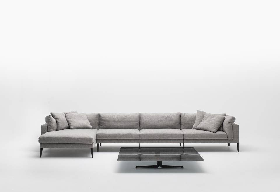 Modular sofa with backrest and armrests structure in multilayer poplar wood and double-panelled fir-wood, padded in differentiated density polyurethane foam, and covering in needle punched, resinated, non-woven polyester fiber, bonded onto a polyamide velveeten backing. Steel seat chassis, with epoxy powder coating, sprung with coated rubber elastic straps, padded in polyurethane foam. Backrest and armrest cushion in prewashed and sterilized goose down, stitched into separate compartments, with polyurethane foam insert. Seat cushion in differentiated density polyurethane foam and Visco-soft insert, covered with acrylic fibre layers. Foot made of laser-cut steel sheet with epoxy powder coating gunmetal grey color. Floor support secured by black PVC feet. Fabric or leather upholstery, both fully removable by zippers and Velcro fastenings. Seat depth: 68 – 134cm.