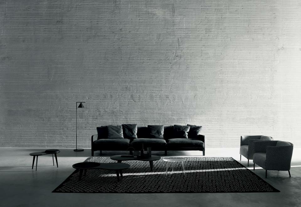 Sofa with backrest frame in double-paneled fir-wood and armrest and seat frame in multilayer poplar wood, padded in polyurethane foam covered with acrylic fiber layers. On the front part of the seat frame is fixed a 3mm steel sheet, coated and shaped according to specific design, covered with acrylic fiber layers. Seat chassis, inserted into the base, in 40x30mm tubular steel, with epoxy powder coating, sprung with coated rubber elastic straps; padding in polyurethane foam covered in 100% polyether thermally bonded onto a polyamide velveteen backing. Seat cushions in differentiated density polyurethane foam and Visco-soft, covered with prewashed and sterilized goose down, stitched into separate compartments and covering in needle punched, resinated, non -woven polyester fiber, bonded onto a polyamide velveteen backing. Backrest cushion in prewashed and sterilized goose down, stitched into separate compartments, with polyurethane foam insert. Fabric upholstery fully removable by zippers and Velcro fastenings. Fix leather upholstery for structure only. Tubular steel feet ?30mm, joined by a bracket, with bronzed epoxy powder coating or feet in solid wood veneered Stone Oak?, screwed to a tubular steel bracket, rectangular section 25x15 mm, painted with matt black epoxy powder; both versions with black PVC tips.