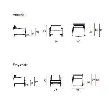 Armchair with backrest frame in double-paneled fir-wood and armrest and seat frame in multilayer poplar wood, padded in polyurethane foam covered with acrylic fiber layers. Seat chassis, inset in the base frame, in solid fir-wood sprung with coated rubber elastic straps; padding in polyurethane foam covered in 100% polyether thermally bonded onto a polyamide velveteen backing. Seat cushions in prewashed and sterilized goose down, stitched into separate compartments, with differentiated density polyurethane foam and Visco-soft insert, and covering in needle punched, resinated, non -woven polyester fiber, bonded onto a polyamide velveteen backing. Backrest cushion in prewashed and sterilized goose down, stitched into separate compartments, with polyurethane foam insert. Fabric upholstery fully removable by zippers and Velcro fastenings. Fix leather upholstery for structure only. Tubular steel feet ?30mm for armchair and ?22mm for easy chair, joined by a bracket, with bronzed epoxy powder coating and black PVC tips, or feet in solid wood footprint 50x50mm section for armchair and 40x40mm for easy chair, veneered Stone Oak?, screwed to a tubular steel bracket, painted with matt black epoxy powder. Seat depth 61cm for armchair and 50cm for easy chair.