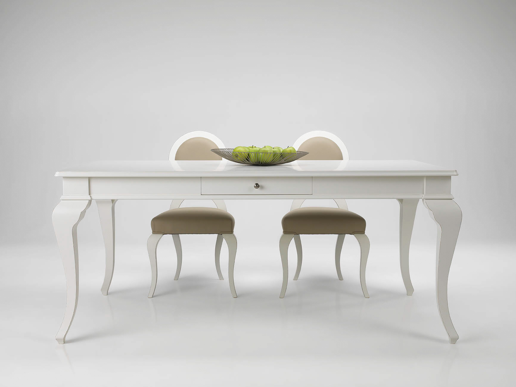 Alba table is equipped with a wide central drawer that could be useful to store cutlery and tablecloth, ready to be used. The pull-out extensions with folding system allow to modify the length of the table easily keeping its precious character.