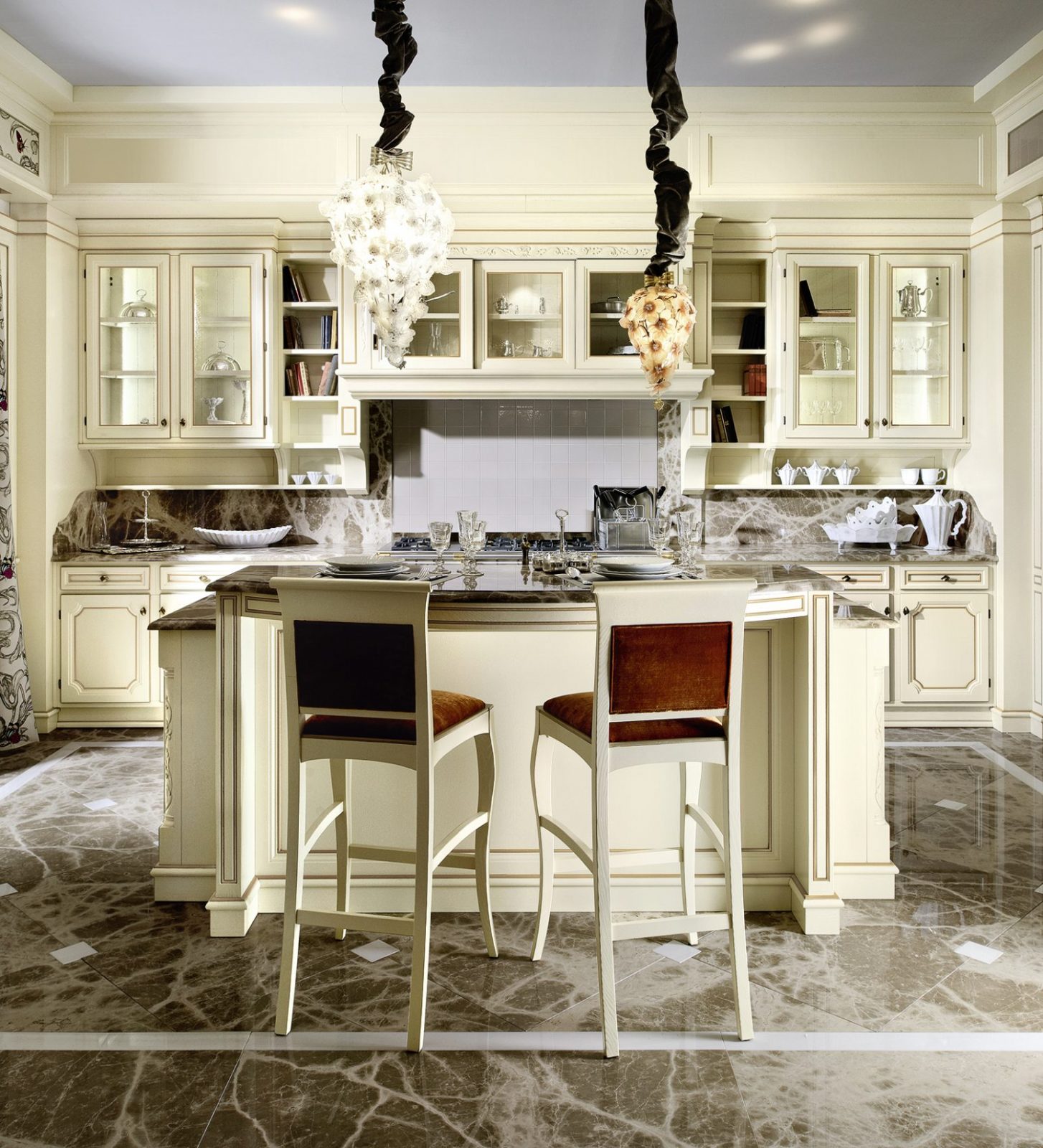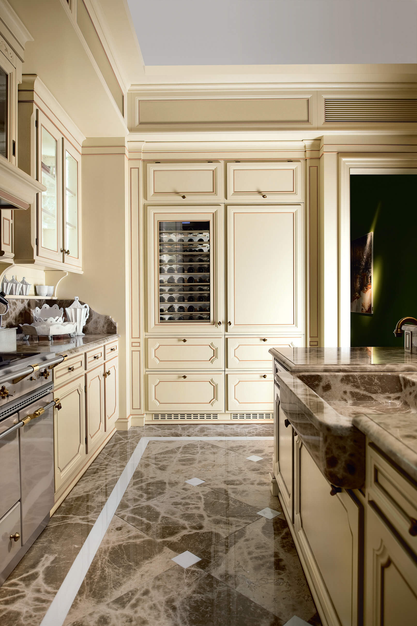 Monterey could be both a kitchen with island or peninsula element, it is characterized by the soft carving and the handicraft geometric decorations which match to traditional materials like marble or brass to define its character.