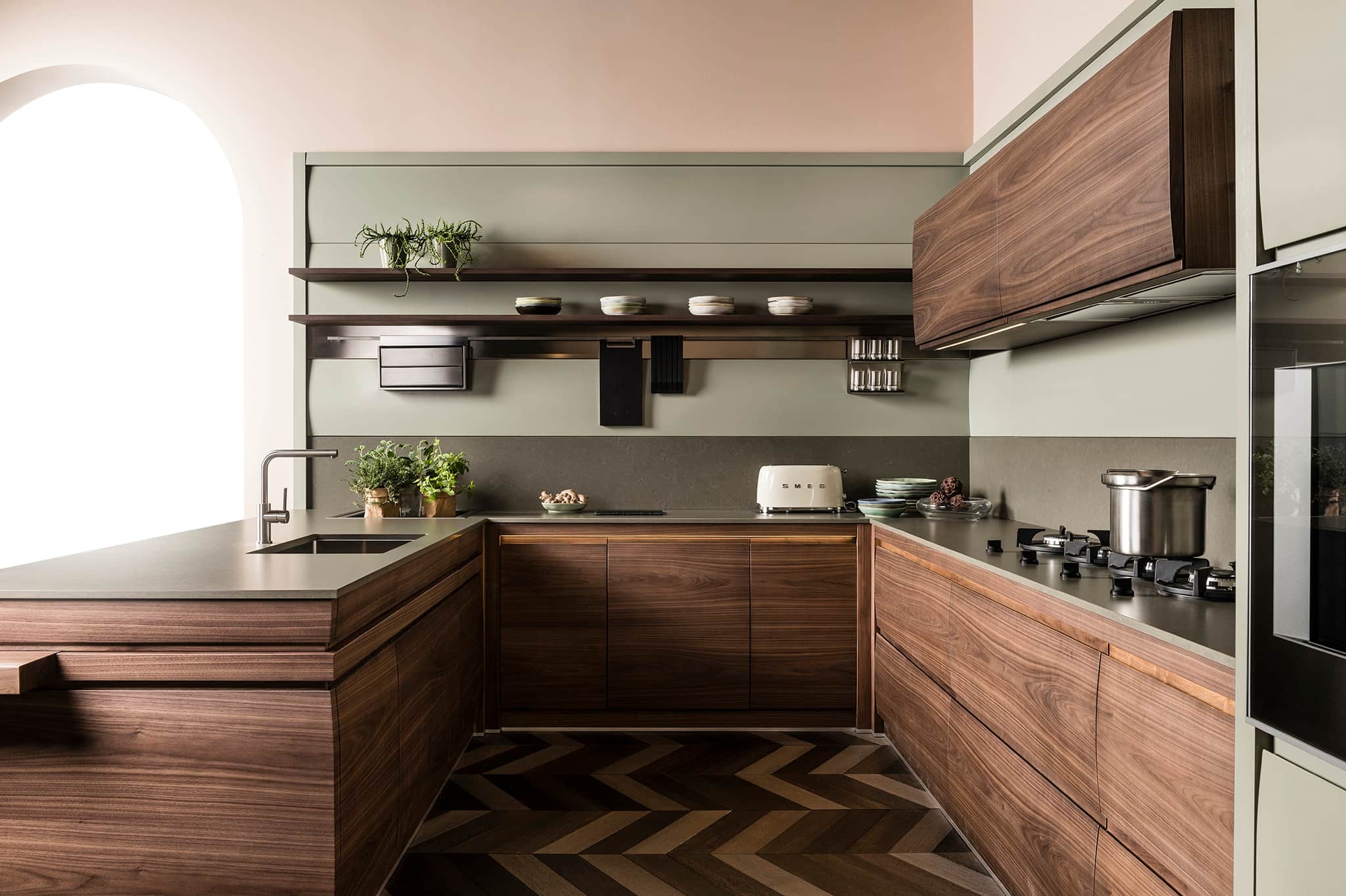 The true protagonist of this contemporary kitchen, characterized by soft and sinuous shapes, is the wood: oak or walnut in natural finishing or, matched to colour shades.